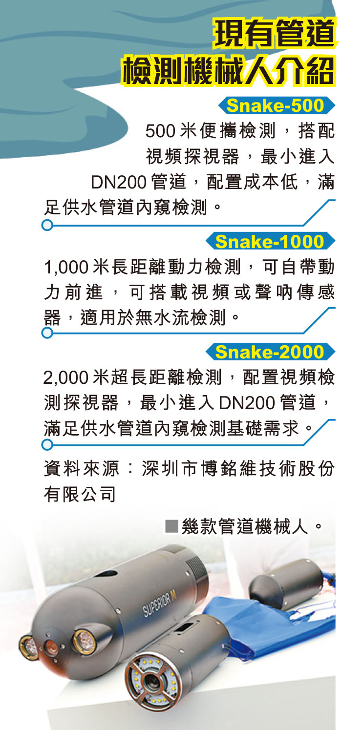 本港不時發生爆水管事故,令市民生活大受影響。香港供水管道錯綜複雜,加上過往外國研發的管道檢測技術並不適合香港環境,水務署昨日宣布成立管道機械人聯合實驗室,專注於開發管道機械人技術,並促進研發名為「智管探」的本地水管檢測機械人,以進入帶壓水管檢測供水管道內的狀況。水務署與香港理工大學及深圳市博銘維技術股份有限公司同日簽訂合作備忘錄,共同開發相關技術。水務署署長黃恩諾指出,管道機械人「如同醫生利用內窺鏡進行內壁檢測,精準探測水管有否裂縫及滲漏。」藉此減低水管爆裂和滲漏風險,目標是於2030年把水管滲漏率降至低於10%。