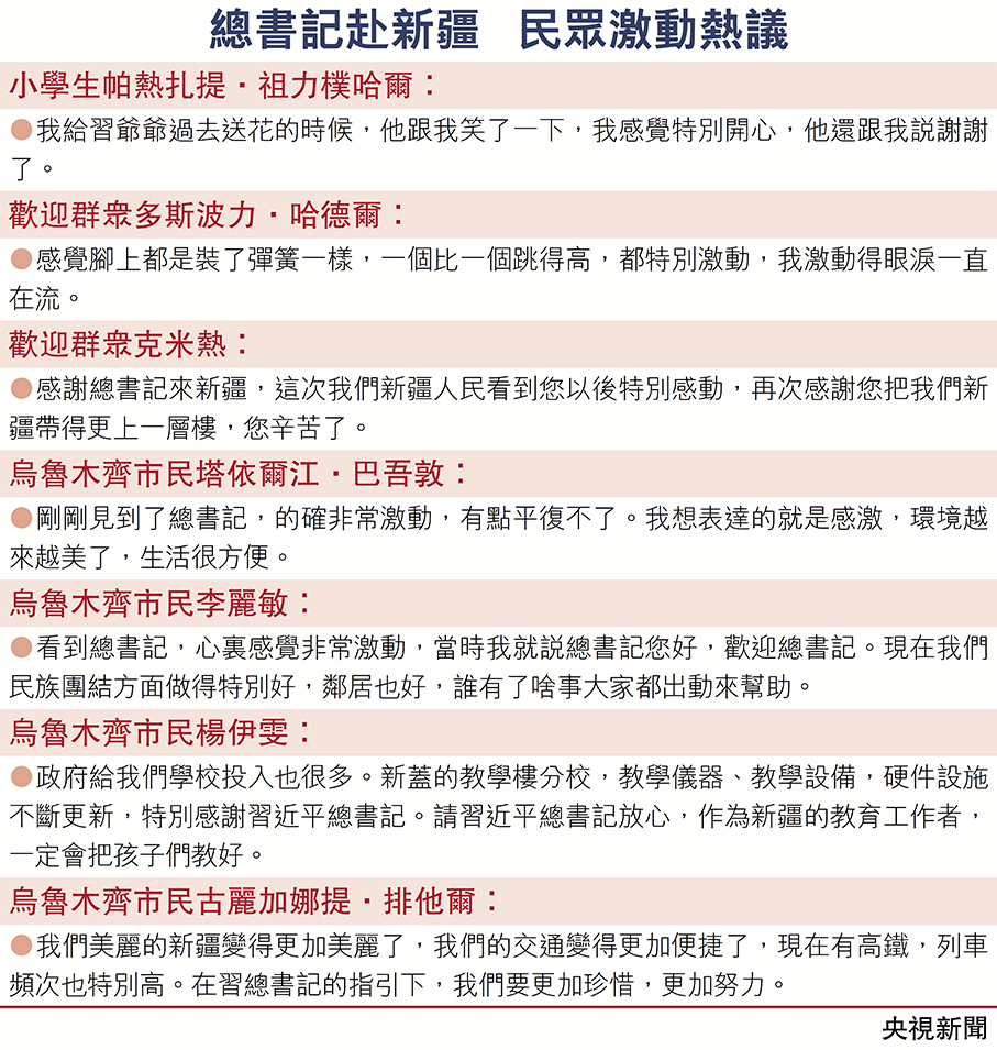 習近平離開新疆時,各族群眾紛紛來到烏魯木齊市區的沿途道路兩旁,手持紅旗,歡呼着向總書記問好,向總書記表達由衷的愛戴。烏魯木齊天山國際機場,身着民族服飾的各族群眾跳起歡快的舞蹈,盡情抒發對以習近平同志為核心的黨中央的感激之情,表達對建設社會主義現代化新疆的堅定信心。