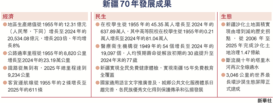 香港文匯報訊 據新華社報道,砥礪奮進七十載,天山南北綻新顏。25日上午,新疆維吾爾自治區成立70周年慶祝大會在新疆人民會堂隆重舉行。中共中央總書記、國家主席、中央軍委主席習近平出席慶祝大會。