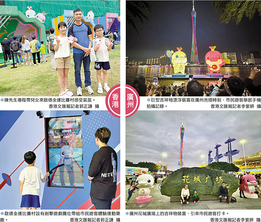 「一路過來看到很多十五運的標誌和吉祥物,氛圍非常濃厚,很吸引人。」在廣州,遊客李先生一家在花城廣場的全運裝置前留下合影,在他們身後,等待與吉祥物拍照的人群排出長隊。
