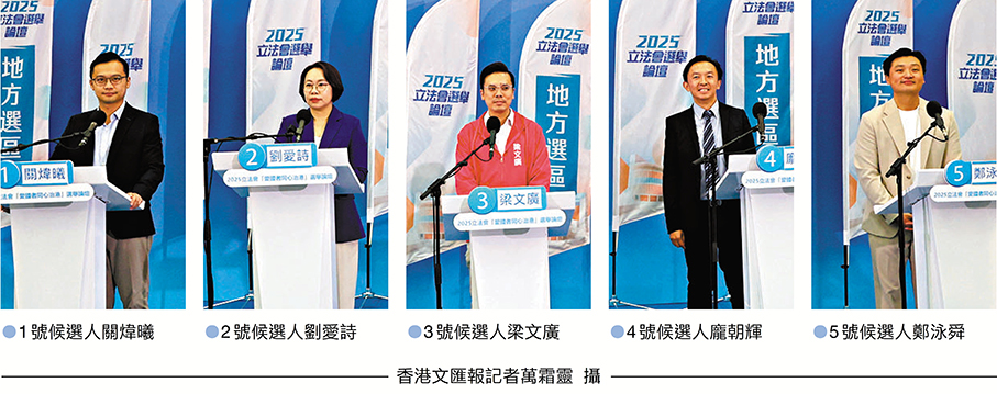 九龍西從人口結構到產業布局都十分多元,昨日的第八屆立法會九龍西地方選區論壇上,5名候選人包括無申報政治聯繫的關煒曦及劉愛詩、西九新動力梁文廣、經民聯龐朝輝、民建聯鄭泳舜同台較量,就如何進一步促進區內經濟發展布局及行業協同發展,提升居民幸福感及和諧共融展開熱烈的辯論。各候選人對如何推動區內文化、旅遊、購物、商業發展,以及促進居民生活、新來港人士、少數族裔共融,積極發表個人見解,同時不忘挑戰對手,在言辭交鋒中碰撞出更多思維的火花,共同為九龍西、為香港發展進行良性建言。
