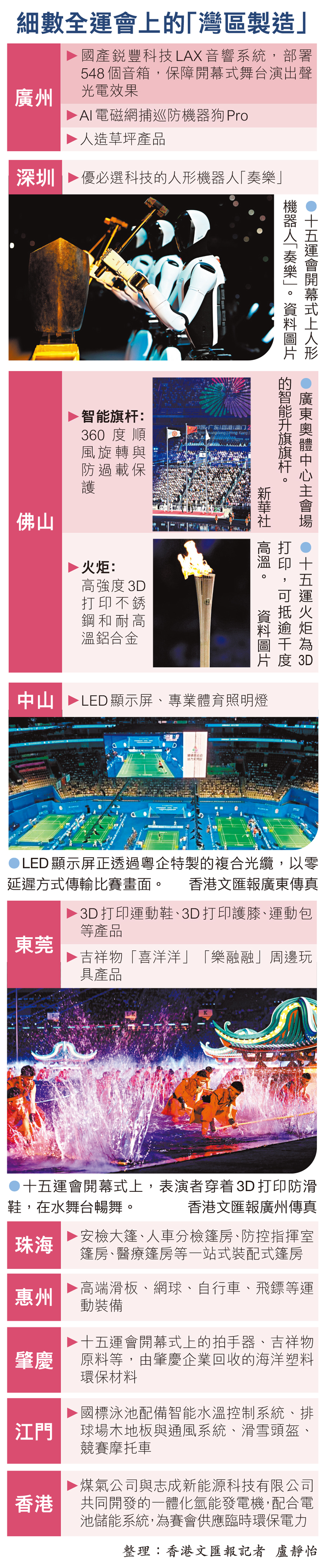 夜幕降臨,廣東奧林匹克體育中心的弧形天幕燈光緩緩亮起,柔和而明亮的光線鋪滿全場,照亮了六萬多名觀眾。11月9日晚,萬眾矚目的十五運會開幕式在此盛大啟幕。1,300平方米的超高清LED巨屏、照度均勻度超過0.9的專業燈光系統、全場零延時的環繞音效,以及粵港澳三地賽事幾乎「秒級」同步的轉播,這一個個令人驚艷的科技亮點背後,都深深烙印着「灣區製造」的印記:燈光設備源自中山,智能機器人出自深圳,聲光電裝備產自廣州……這些「廣東製造」的優質產品,是開幕式順利呈現的堅實保障,更是十五運會上不可或缺的「幕後主角」。 ●香港文匯報記者 盧靜怡 廣州報道