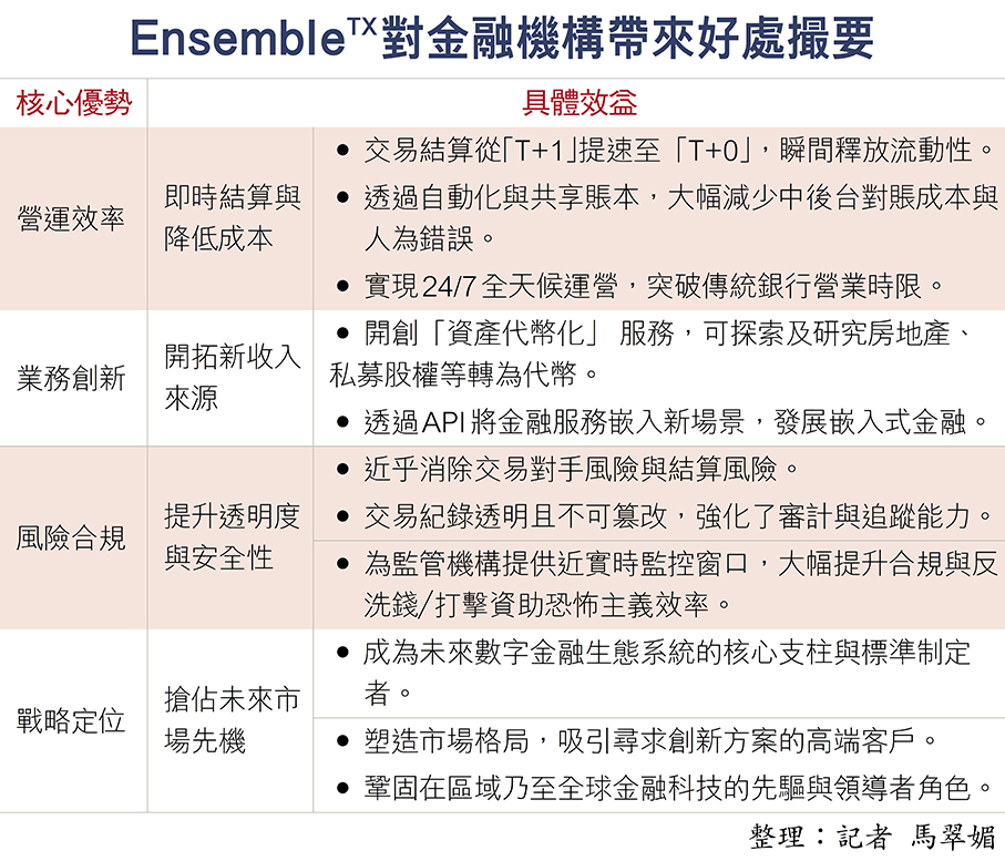 Ensemble項目是香港金管局基於區塊鏈平台的金融市場基礎設施,旨在促進代幣化貨幣(如批發層面央行數碼貨幣 wCBDC 及代幣化存款)與數碼資產之間的無縫交割,是本港代幣化市場發展的重要基石和推動力,該項目在2024年8月啟動沙盒試驗,讓參與機構使用實驗型代幣化存款對數碼資產交易結算用例進行端對端測試。金管局本月中正式推出EnsembleTX,標誌Ensemble項目進入正式試行階段,首批重點推動市場參與者以代幣化存款進行代幣化貨幣市場基金交易,實現即時流動性管理。金管局表示,EnsembleTX將於2026年全年持續運行,並逐步升級至支援代幣化央行貨幣,提供24×7全天候結算,為香港代幣化生態系統奠定更廣闊基礎。