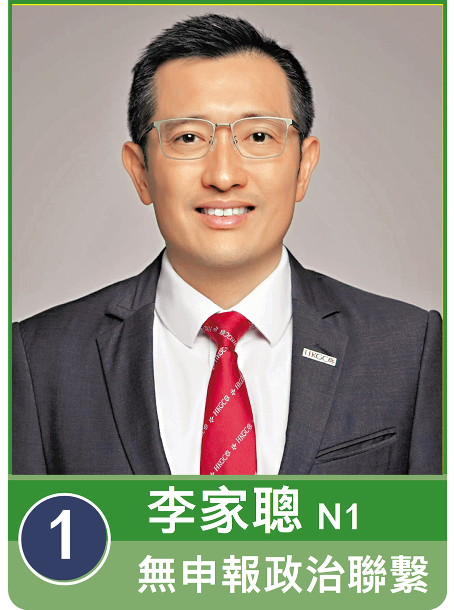 N1號候選人李家聰是公司董事,他提出的參選政綱包含四個政策方向以及兩個核心支柱,他希望在「發揮香港所長、服務國家所需」的大原則下,為商界發聲與開拓新機遇為主軸,輔以務實進取的態度,通過連接國家戰略、大灣區資源與全球資本,打造香港成為國家經濟轉型升級的全球樞紐。