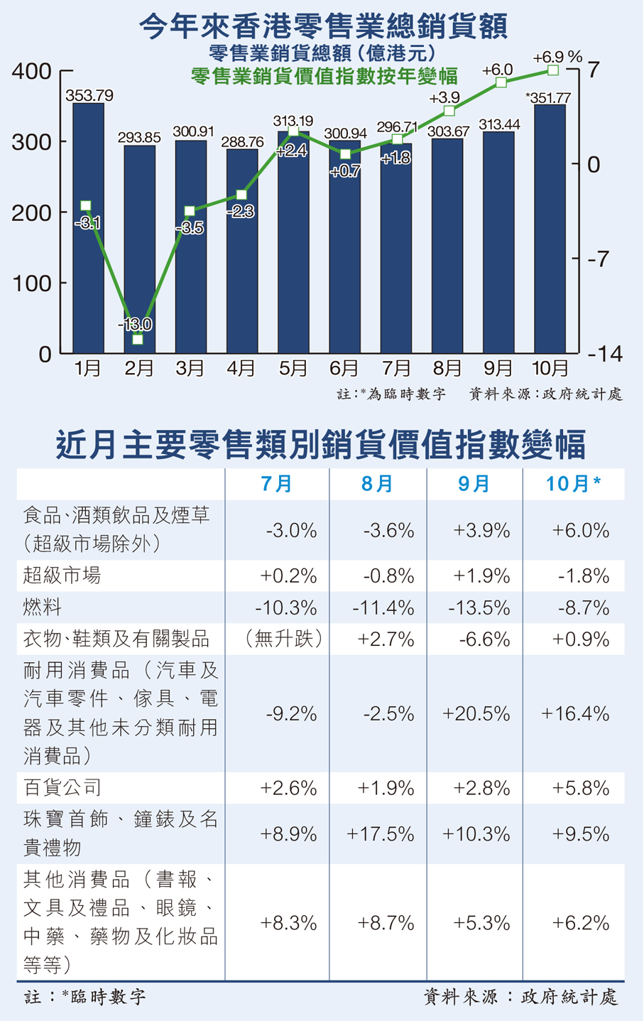 根據統計處數字,按類別看,10月份按年銷貨價值指數升幅最大的是「耐用消費品」當中的電器及其他未分類耐用品上升24.6%;其次為珠寶首飾、鐘錶及名貴禮物(銷貨價值指數上升9.5%);食品、酒類飲品及煙草(上升6.0%);百貨公司貨品(上升5.8%);服裝(上升0.9%);藥物及化妝品(上升3.8%);鞋類、有關製品及其他衣物配件(上升1.1%);以及眼鏡店(上升4.4%)。超級市場貨品的銷貨價值下跌1.8%。其次為汽車及汽車零件(銷貨價值下跌20.1%);燃料(下跌8.7%);書報、文具及禮品(下跌0.6%);傢具及固定裝置(下跌2.3%);以及中藥(下跌6.6%)。