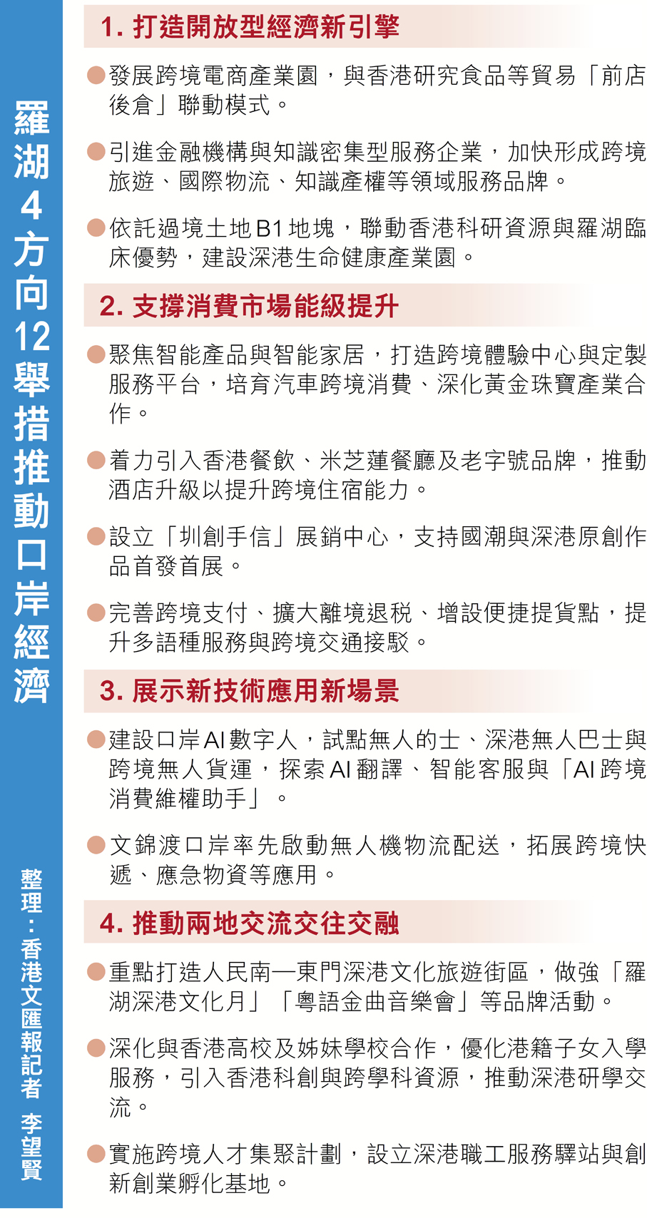 香港特首李家超在《2025年施政報告》中提出多項新措施,加快發展北部都會區。一河之隔的深圳亦不斷推動與香港的合作發展,近日,羅湖區在深圳率先推出《羅湖區推動口岸經濟高質量發展若干措施》(以下簡稱《若干措施》),以構建「商貿流通樞紐、入境消費首站、場景示範窗口、人才交流紐帶」四位一體的特色口岸經濟帶為核心,提出四大方向12項主要舉措,聯動香港全面激活口岸經濟潛力,包括聯動香港科研資源與羅湖臨床優勢,建設深港生命健康產業園;設口岸AI數字人推廣生物識別、智能引導等服務。香港貿易發展局大灣區及華中首席代表曾沂靖認為,羅湖推動口岸經濟高質量發展若干措施,恰好與香港北部都會區戰略形成精準互補。在這片銜接深港的關鍵區域,兩地將充分發揮互補優勢,在新消費、新科技、新產業等領域深化合作,讓深圳的創新活力與香港的國際資源實現高效融合,打造深港協同發展的「黃金紐帶」。●香港文匯報記者 李望賢 深圳報道