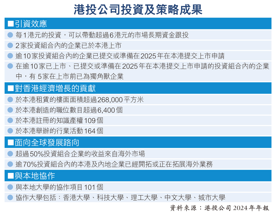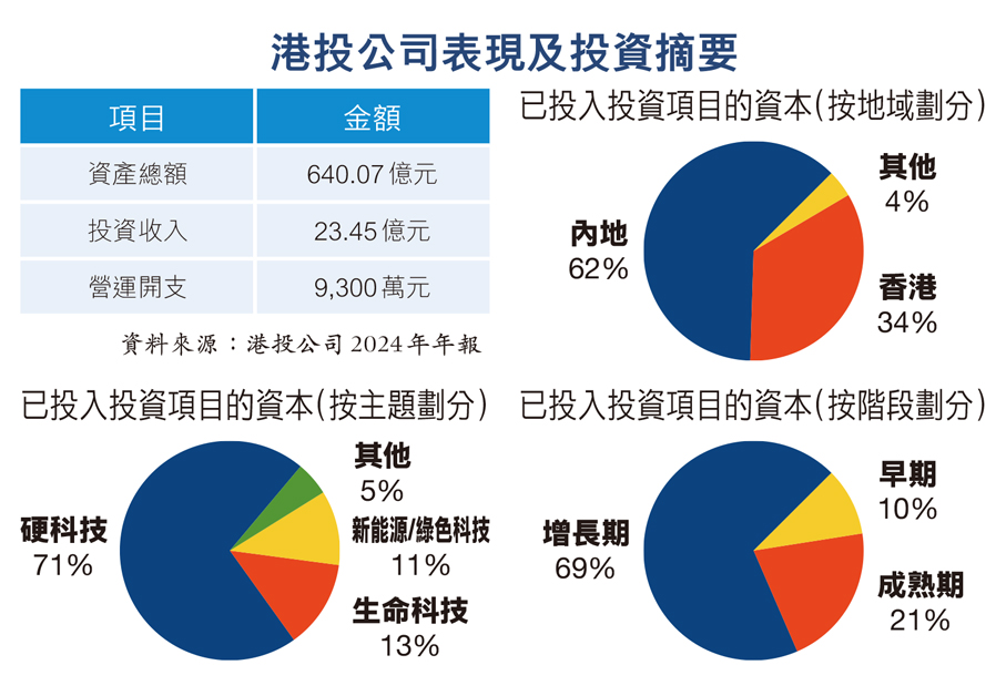 港投公司在年報中表示,截至去年底,已投入項目的資金佔初始資金規模少於五分之一,並已錄得23億元的投資收入,營運利潤為22.5億元。至去年底止,港投的資產總額約640億元,政府提供的資金總額及累計收益為634.9億元。港投目前所投資的逾150個項目中,涵蓋硬科技、生命科技及新能源與綠色科技三大重點賽道,以及相關應用領域。