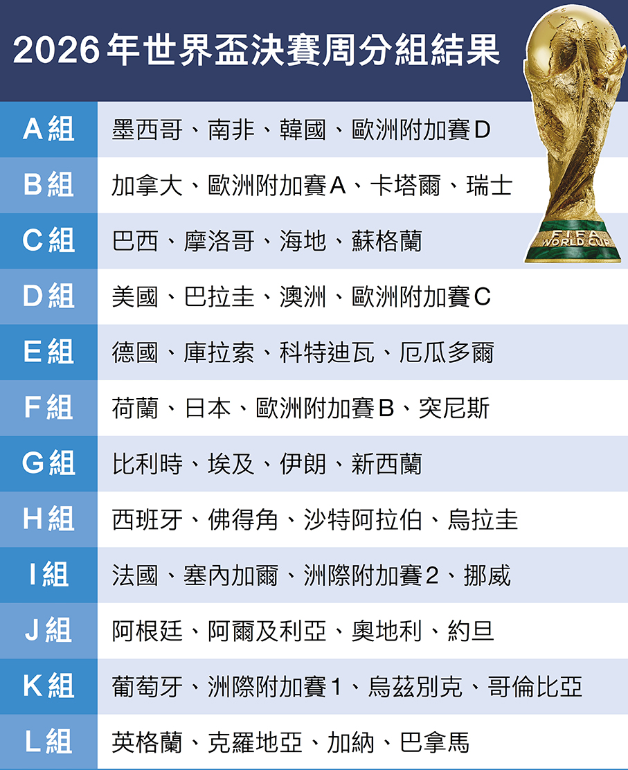 香港文匯報訊(記者 葉詩敏)由美國、加拿大及墨西哥合辦的2026年世界盃,周六凌晨(6日)在華盛頓進行分組賽抽籤。其中I組有去屆亞軍法國惡鬥挪威,意味着兩大標誌性球星基利安麥巴比及艾寧夏蘭特可望碰頭。