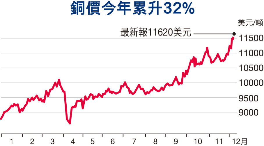 香港文匯報訊(記者 倪巍晨 上海報道)暢旺的需求端疊加供應端減產預期,不斷強化銅價上漲邏輯。本月3日,倫敦金屬交易所(LME)銅價一度觸及每噸11,540元(美元,下同)的歷史新高。翌日,滬銅期貨主力合約亦站上每噸9萬元人民幣關口,創歷史新高。瑞銀投資銀行中國基礎材料行業研究主管丁月麗表示,過去數年全球銅礦供應逐年趨緊,今年新增供應幾乎接近於零,明年銅供應端料難大幅修復。與之對應的是,伴隨着全球能源結構的轉型,市場對銅的需求與日俱增,明年全球銅需求增幅或達3%,「2026年銅價中樞有望升見每噸11,464元,同比增幅逾15%」。