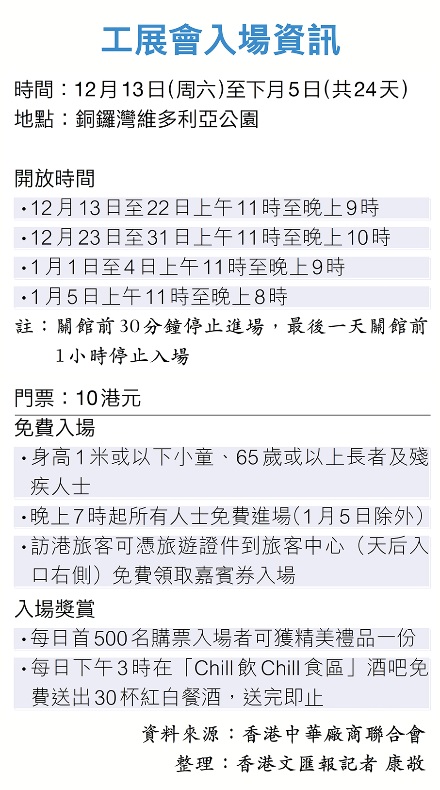 另外,「美食廣場」和「Chill飲Chill食區」則集齊眾多本地街頭小食、環球美食、各式酒類及佐酒小食。「Chill飲Chill食區」更擴大一倍,每日下午3時還有30杯免費紅白酒供應,相信能吸引年輕客群。工展會的入場費為港幣10元,於本月12日或之前網上購票可享港幣8元的早鳥優惠。同時,今年工展會特設旅客免費入場的活動,希望藉此機會向更多旅客展示香港工業魅力。