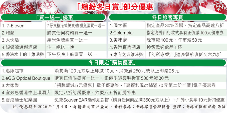 此外,多間酒店及餐飲食肆也會提供支持,優惠範圍涵蓋衣、食、住、行、娛樂等,全方位滿足消費者的不同需求。是次「繽紛冬日賞」更特設「冬日旅客專賞」,例如有珠寶首飾店推出購買享八折優惠、食肆推出晚市減100元優惠等(見表),為訪港旅客帶來便利和貼心享受,體現香港好客精神。