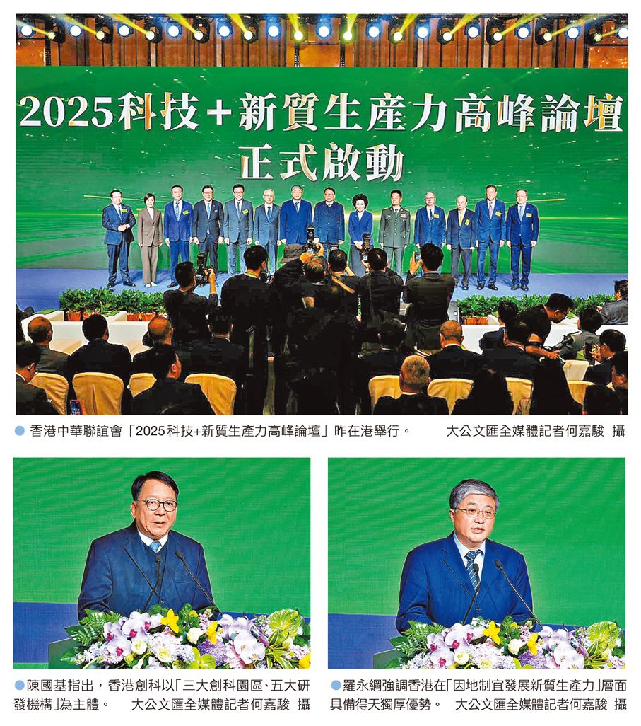 香港中華聯誼會昨日舉辦「2025科技+新質生產力高峰論壇」,旨在進一步深化對新質生產力的認識,探索其核心驅動力與發展路徑。署理行政長官陳國基在致辭中表示,國家正全面推進高質量發展,加快發展新質生產力,香港在「一國兩制」下擁有背靠祖國、聯通世界的獨特優勢,特區政府將繼續完善創科政策體系,為香港的經濟注入高質量發展的新動力。中央政府駐港聯絡辦公室副主任羅永綱指出,香港在國家國民經濟和社會發展進程中,一直是參與者、貢獻者和受益者,當前香港正積極擁抱科技革命,扮演「超級聯繫人」、「超級增值人」角色,全力為國家在關鍵領域突破作出新的貢獻。