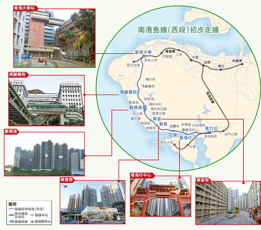 香港島南區居民期盼多年的南港島線(西段)項目終有望落實興建,特區政府運輸及物流局昨日宣布,香港特區行政長官會同行政會議已批准政府邀請香港鐵路有限公司開展該項目的詳細規劃及設計。路線全長約7.5公里,將以高架橋及隧道連接香港南區與西區,設有黃竹坑、香港仔、田灣、華貴、華富、數碼港、瑪麗醫院及香港大學8個車站,以及一個鄰近數碼港站的車廠,預計前期工程於2027年展開,並於2034年或之前竣工。項目將採用智慧綠色集體運輸系統,建造成本預算較地底重型鐵路方案少四成,並可提早約兩年竣工。