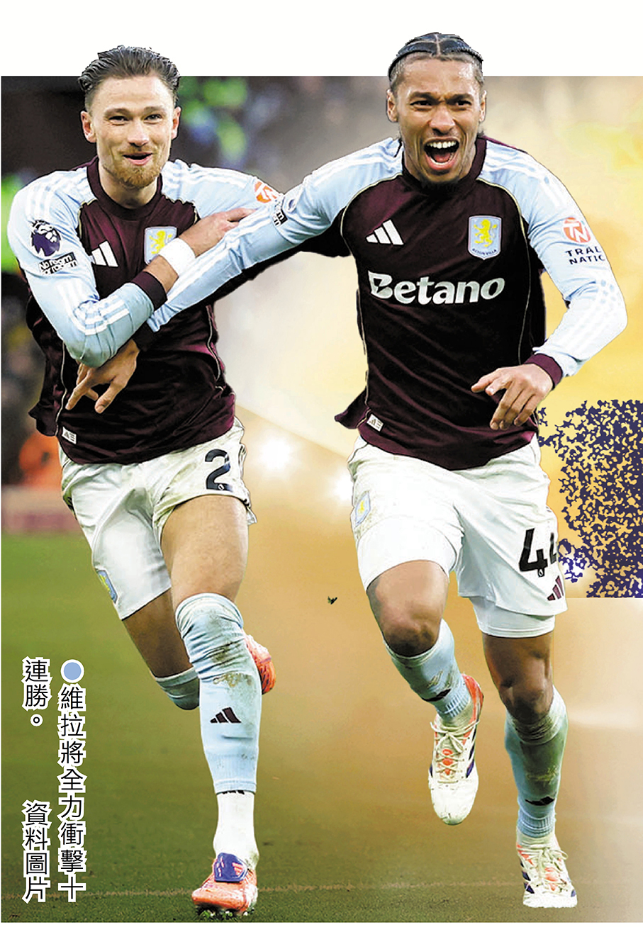 英超於香港時間周一(22日)凌晨上演大戰,由阿士東維拉主場迎戰「紅魔鬼」曼聯。維拉是近期走勢最強勁的英超隊伍,至今已累積正式比賽九連勝,是役面對麥比奧莫、阿密特迪亞路和馬沙拉奧因歸隊出戰非洲國家盃缺陣,更有主力中場卡斯米路停賽的曼聯,有力衝擊十連勝。(Now611及621台周一0:30a.m.直播)