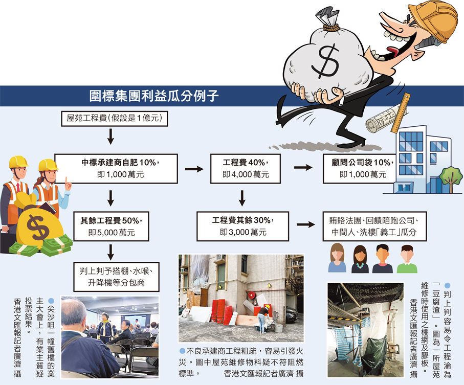 圍標(bid rigging),一種以合謀手段共同入標,達至阻礙公平競爭的商業行為。曾長期參與圍標的工程界「金手指」馬先生及一名資深工程師,向香港文匯報拆解香港舊樓維修工程圍標的水深程度,以及禁之不絕的原因是隱秘性極高,舉證極其困難。問題核心是顧問公司、法團及工程承辦商之間的利益輸送,飾演軍師的顧問公司以偏低報價吸引小業主使用,中標後便拉攏法團擺出各種煙幕戲碼,讓合謀的承辦商在業主大會的「假民主」投票中勝出,竣工後各參與者瓜分天價工程費。「金手指」爆料,近半工程費用會落入圍標集團口袋裏,「顧問公司分走一成,餘下四成分予陪跑公司、中標承建商法團相關人等、其他相關人等。」最大輸家是夾錢的小業主,「個工程一半價錢已能搞定,枉花四五成養肥圍標集團,最終或換來偷工減料的豆腐渣工程。」 ●香港文匯報記者 廣濟