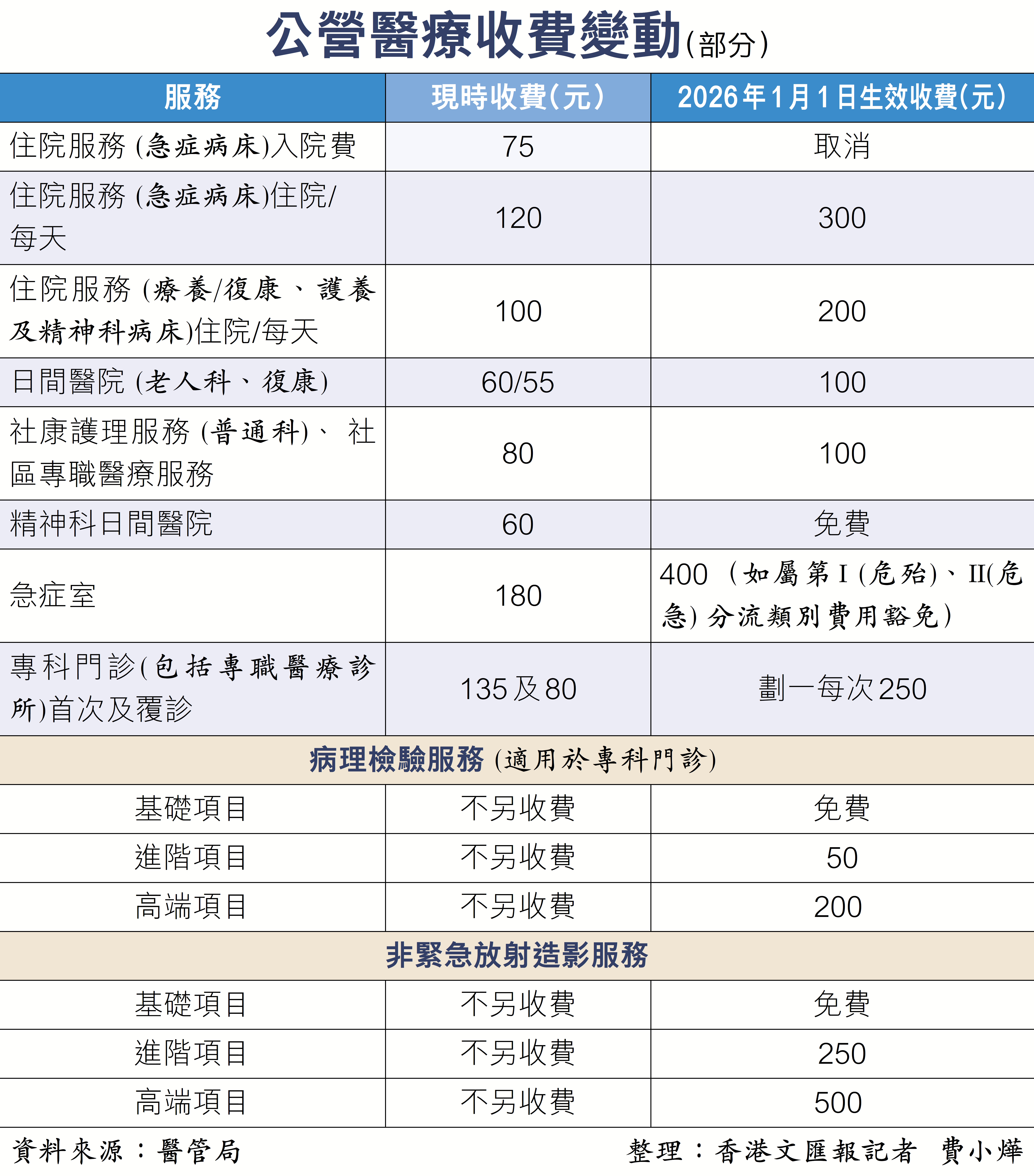 醫管局於明天起全面推行公營醫療收費改革的各項措施,其中急症室收費會由現時劃一收180元改為兩級制,除了危殆或危急病人可獲豁免繳費外,其餘類別的病人,收費一律加至400元,與私家診所收費相若;另外住院服務、專科門診、病理檢驗服務等收費亦有調整(見右表)。