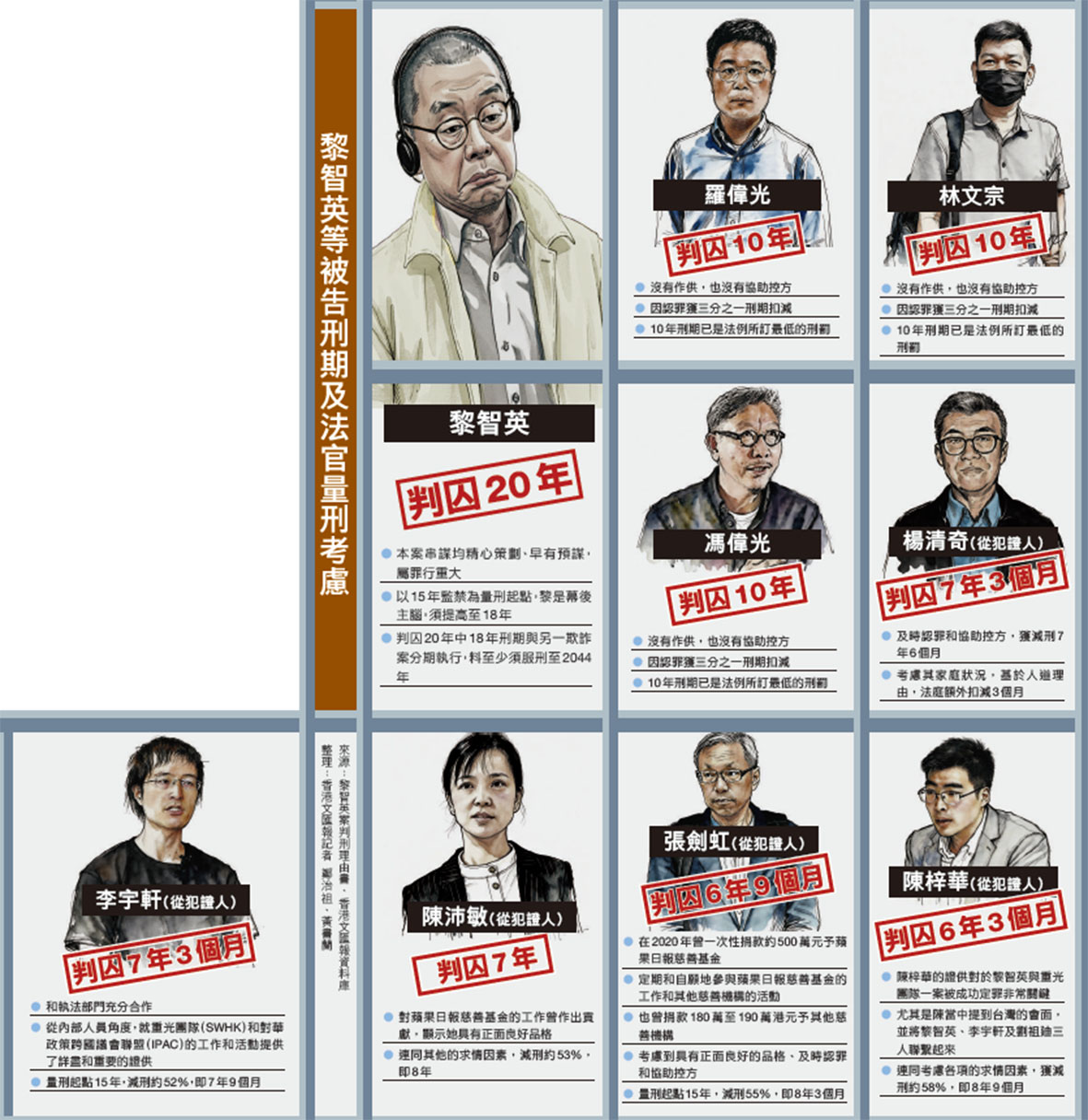 被裁定一項串謀刊印、發布、出售、要約出售、分發、展示及/或複製煽動刊物罪和兩項串謀勾結外國或者境外勢力危害國家安全罪全部罪成的壹傳媒創辦人黎智英,昨日被判監禁總刑期20年,其餘8名被告監禁6年3個月至10年。判刑理由書長達47頁,詳細列明每項控罪的量刑起點、刑期考慮因素,法庭強調黎智英確實促成了外國政府針對香港特區以及針對中央及香港特區政府官員採取所謂「制裁」等,屬罪行重大,更是危害國家安全的幕後主腦和推動者,精心策劃、早有預謀,但法庭考慮到他的健康狀況等因素,酌量減刑。不少經歷過黑暴的香港市民昨早到西九龍裁判法院現場等待判刑結果,見證正義到來的歷史時刻,紛紛讚好。他們說判決體現了香港法治的公平公正,對反中亂港分子有強烈的震懾作用,也為歷史作出交代(見A7)。