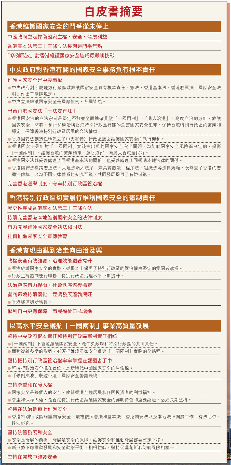 白皮書除前言、結束語外分為五個部分,分別是香港維護國家安全的鬥爭從未停止、中央政府對香港有關的國家安全事務負有根本責任、香港特別行政區切實履行維護國家安全的憲制責任、香港實現由亂到治走向由治及興、以高水平安全護航「一國兩制」事業高質量發展。