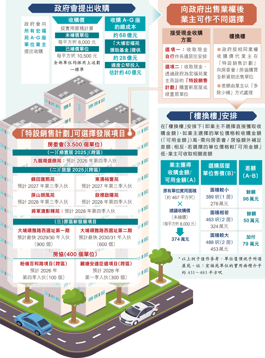 領導「應急住宿安排工作組」的特區政府財政司副司長黃偉綸昨日公布宏福苑火災受影響居民的長遠安置方案:特區政府將動用「大埔宏福苑援助基金」28億元及約40億元公帑,以現金或「樓換樓」方式收購宏福苑A至G座七幢樓宇合共1,736個單位的業權,未補及已補地價單位收購呎價分別為8,000元及10,500元,較香港測量師學會估價高約三分之一,每戶可獲約344.8萬元至507.1萬元不等,預計今年第三季發放款項。選擇「樓換樓」的業主,將獲發等值於原單位價值的「樓換樓券」,購買新單位時按「多除少補」處理差額。政府同時推出「特設銷售計劃」,提供房委會及房協的資助房屋單位供業主選擇,合共有10個項目3,900個單位,6月30日前已簽訂臨時買賣合約者可獲安排首批優先揀樓。業主須於今年8月31日前確認意向。 ●香港文匯報記者 李千尋