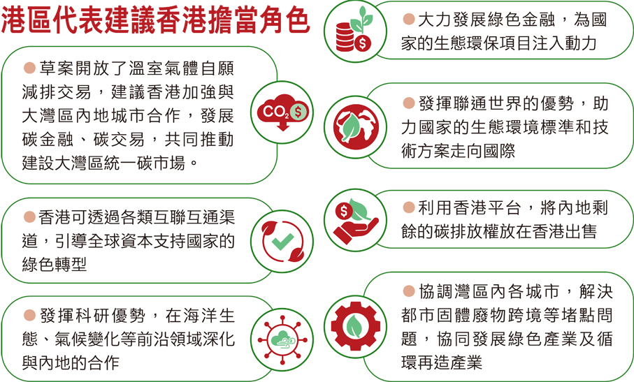 文頴怡代表關注碳權交易的國際化路徑。她建議可利用香港平台,將內地剩餘的碳排放權放在香港出售。她希望國家未來能增撥資源,積極對接國際標準,吸引更多海外企業到香港購買中國的碳權產品,從而在國際市場中爭取訂立規則的話語權。
