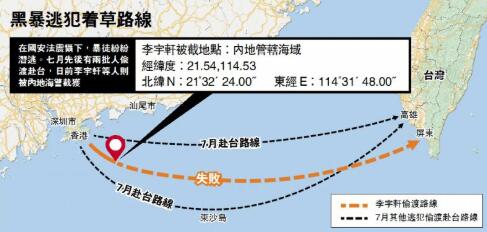 23日早上六時許,李宇軒等12名暴亂青年從布袋澳乘坐「大飛」,企圖偷渡至屏東,結果在果洲群島對出南海的中國管轄海域被截獲,潛逃台灣的好夢成空。一名了解偷渡內情的船家透露,根據該「大飛」被截獲的位置計算,距離台灣屏東約有657公里,若乘坐一般漁船約需40個小時才能抵達,但以大馬力(900匹)的快艇則只需九個小時。