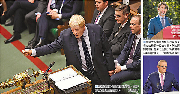 英國的政治制度亦隨着英國的殖民統治,發展至加拿大、澳洲和新西蘭等,雖然細節稍有不同,但整體上保留行政首長與立法機關一致的特點,例如加拿大總理杜魯多、澳洲總理莫里森均是國會議員,向國會負責。 ■綜合報道
