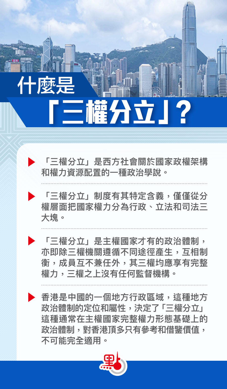 香港是中國的一個地方行政區域,其政治架構根據全國人大制定的香港基本法規定而設立。按照基本法規定, 特別行政區各權力部門,包括行政長官、行政機關、 立法機關、司法機關在行使各自權力時,都與最高國家權力機關或最高國家行政機關發生聯繫,如行政長官要向中央人民政府負責,執行中央政府發出的指令,又如特區立法要報全國人大常委會備案,法院審理案件需解釋的基本法條文有些要報請全國人大常委會解釋並以此解釋為準,等等。充分說明,香港特別行政區所實行的高度自治,是由中央授權的,是有限度的。這種地方政治體制的定位和屬性,決定了「三權分立」這種通常在主權國家完整權力形態基礎上的政治體制,對香港頂多只有參考和借鑒價值,不可能完全適用。