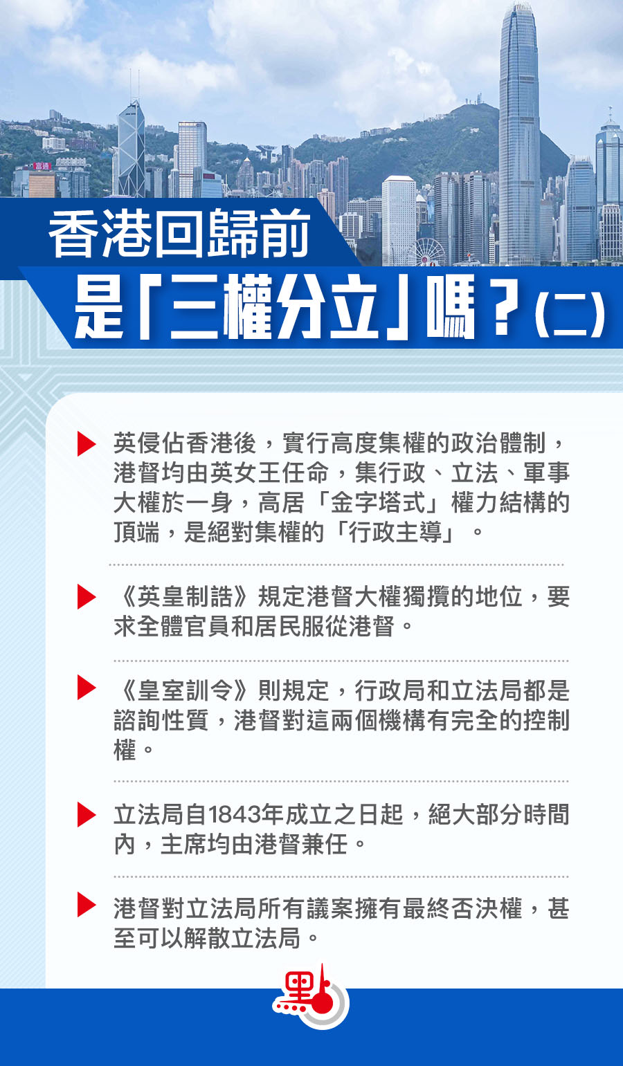 英侵佔香港後,實行高度集權的政治體制,港督均由英女王任命,集行政、立法、軍事大權於一身,高居「金字塔式」權力結構的頂端,是絕對集權的「行政主導」。