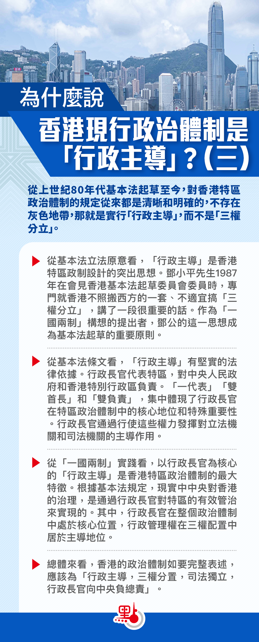 從「一國兩制」實踐看,以行政長官為核心的「行政主導」是香港特區政治體制的最大特徵。在「一國兩制」下,中央不直接介入特區政府的日常管理。中央對香港的治理,主要是通過行政長官在整個政治體制中處於核心位置,行政管理權在三權配置中居於主導地位來實現。即便特區內部規定了行政、立法、司法「三權分置」 架構,相互也有配合制衡關係,保有司法獨立,但並不代表三種權力對等,更不能說香港的政治體制是「三權分立」體制。