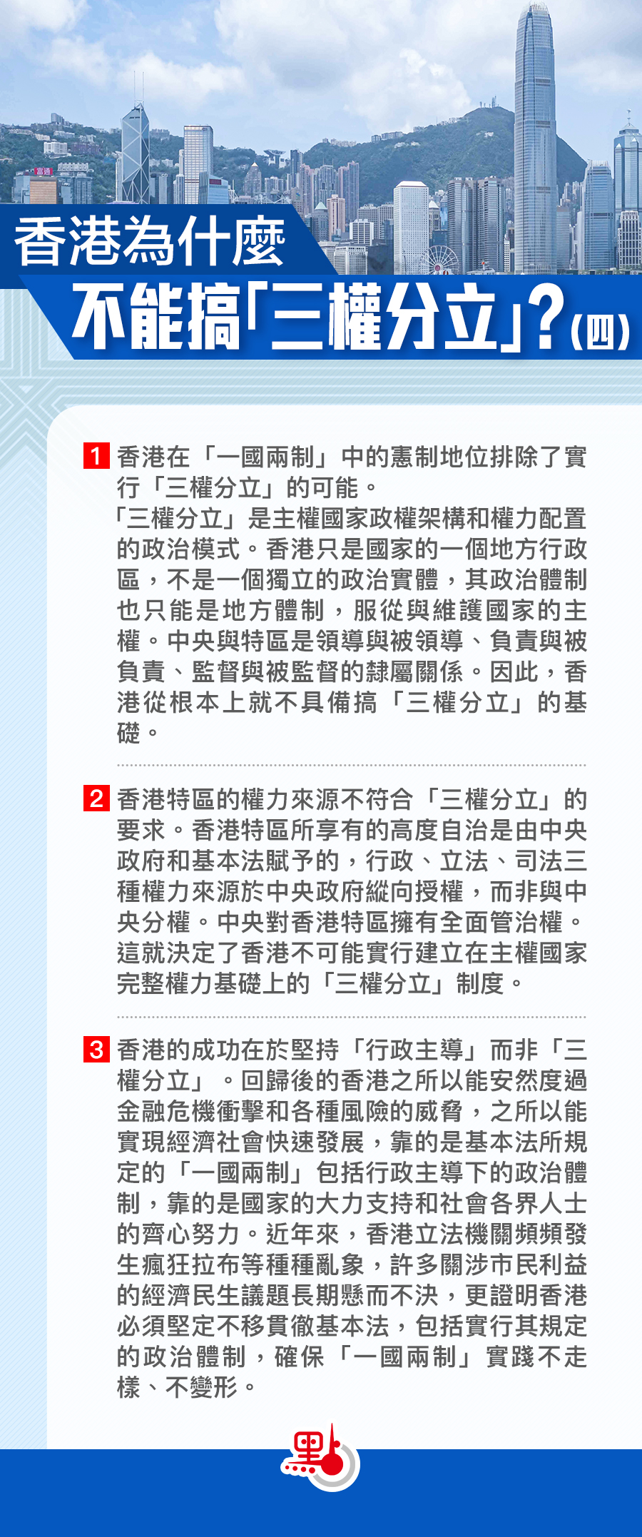 3.香港的成功在於堅持「行政主導」而非「三權分立」。「鞋子合不合腳,自己穿着才知道」。回歸前,香港從小漁村一步步發展為國際大都市,其成功與「三權分立」無關。回歸後的香港之所以能安然度過金融危機衝擊和各種風險的威脅,之所以能實現經濟社會快速發展,靠的是基本法所規定的「一國兩制」包括行政主導下的政治體制,靠的是國家的大力支持和社會各界人士的齊心努力。近年來,香港立法機關頻頻發生瘋狂拉布等種種亂象,許多關涉市民利益的經濟民生議題長期懸而不決,更證明香港必須堅定不移貫徹基本法,包括實行其規定的政治體制,確保「一國兩制」實踐不走樣、不變形。
