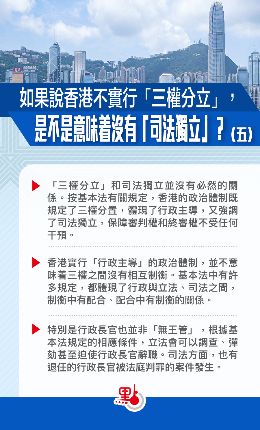 此外,香港實行「行政主導」的政治體制,並不意味着三權之間沒有相互制衡。基本法中有許多規定,都體現了行政與立法、司法之間,制衡中有配合、配合中有制衡的關係。特別是行政長官也並非「無王管」,根據基本法規定的相應條件,立法會可以調查、彈劾甚至迫使行政長官辭職。司法方面,也有退任的行政長官被法庭判罪的案件發生。