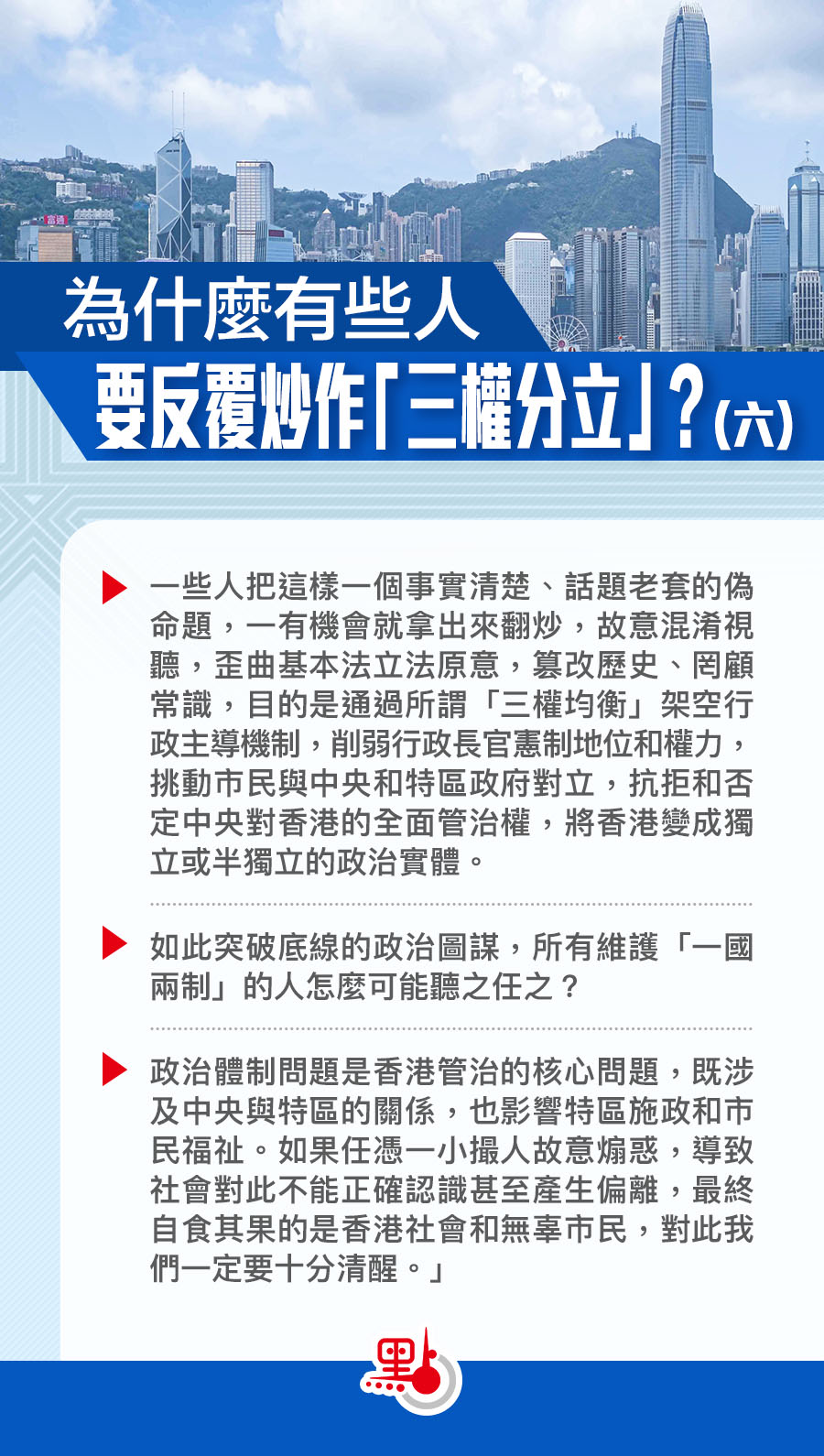 一些人把這樣一個事實清楚、話題老套的偽命題,一有機會就拿出來翻炒,故意混淆視聽,歪曲基本法立法原意,篡改歷史、罔顧常識,目的是通過所謂「三權均衡」架空行政主導機制,削弱行政長官憲制地位和權力,挑動市民與中央和特區政府對立,抗拒和否定中央對香港的全面管治權,將香港變成獨立或半獨立的政治實體。如此突破底線的政治圖謀,所有維護「一國兩制」的人怎麼可能聽之任之?