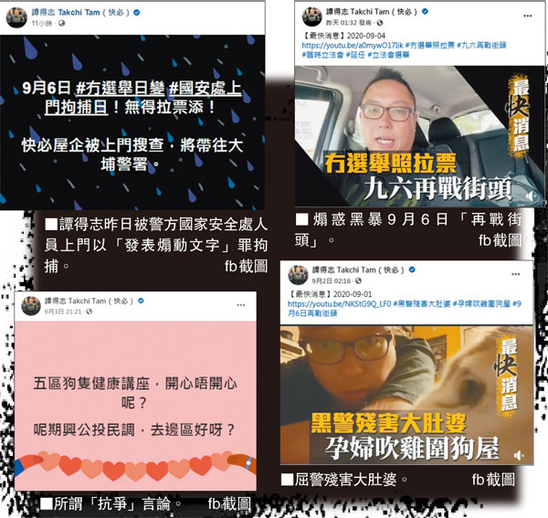攬炒及煽暴政棍、「人民力量」副主席譚得志(快必)涉嫌今年6月至8月期間,最少29次以擺街站舉辦防疫健康講座為名,實質發表引起對政府的憎惡和藐視以及引起民間不滿的煽動文字,同時在facebook等平台直播有關訊息,昨日被警方國家安全處人員上門以「發表煽動文字」罪拘捕,一部懷疑與案有關的手提電話亦被檢走蒐證。根據記錄,譚得志已非首次涉及涉嫌煽惑暴力和仇恨或涉及其他刑事罪行被捕。■香港文匯報記者 蕭景源