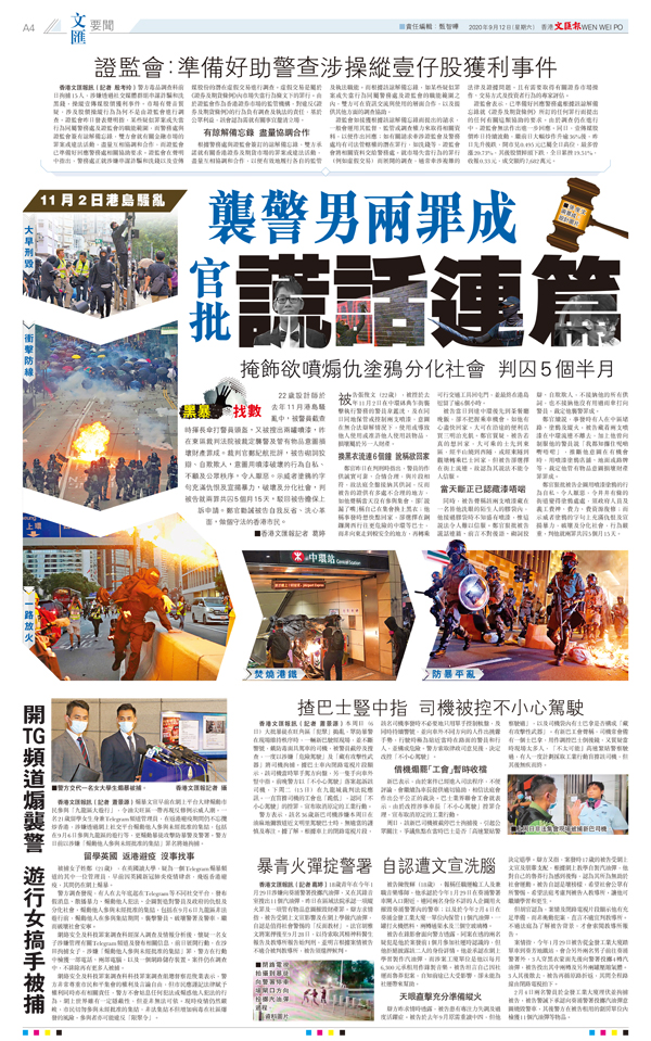 22歲設計師於去年11月港島騷亂中,被警員截查時揮長傘打警員頭盔,又被搜出兩罐噴漆,昨在東區裁判法院被裁定襲警及管有物品意圖損壞財產罪成。裁判官鄭紀航批評,被告砌詞狡辯、自欺欺人,意圖用噴漆破壞的行為自私、不顧及公眾秩序,令人厭惡。示威者塗鴉的字句充滿仇恨及宣揚暴力,破壞及分化社會,判被告就兩罪共囚5個月15天,駁回被告擔保上訴申請。鄭官勸誡被告自我反省、洗心革面,做個守法的香港市民。