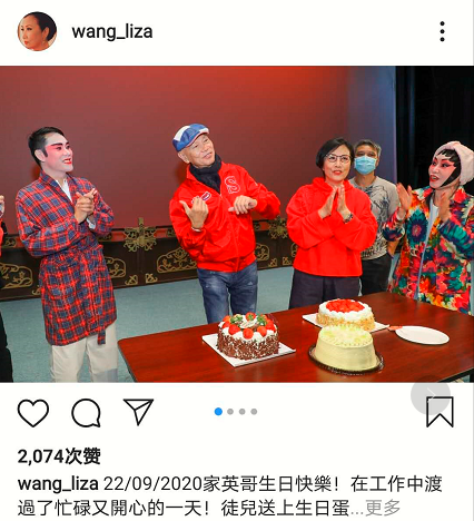 阿姐貼出合照並留言祝福:「家英哥生日快樂!在工作中度過了忙碌又開心的一天!徒兒送上生日蛋糕,戲班兄弟姊妹為你唱生日歌!好有福氣!希望你健康、平安、快樂!」家英哥與汪阿姐皆穿上紅色上衣,甚為合襯,眾人為家英哥送上3個蛋糕,又一起穿上紅色服裝為家英哥祝賀。