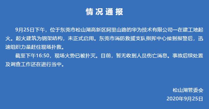 (香港文匯網記者 盧靜怡)今日(25日)下午,華為東莞松山湖園區一處大樓突發大火。網傳消息稱起火地點為華為松山湖實驗室。東莞市松山湖管委會負責人在今晚六點多回應本網查詢表示,起火地點是華為一在建工地,並未正式啟用。而大火已於下午16:50撲滅,暫無人員傷亡消息。
