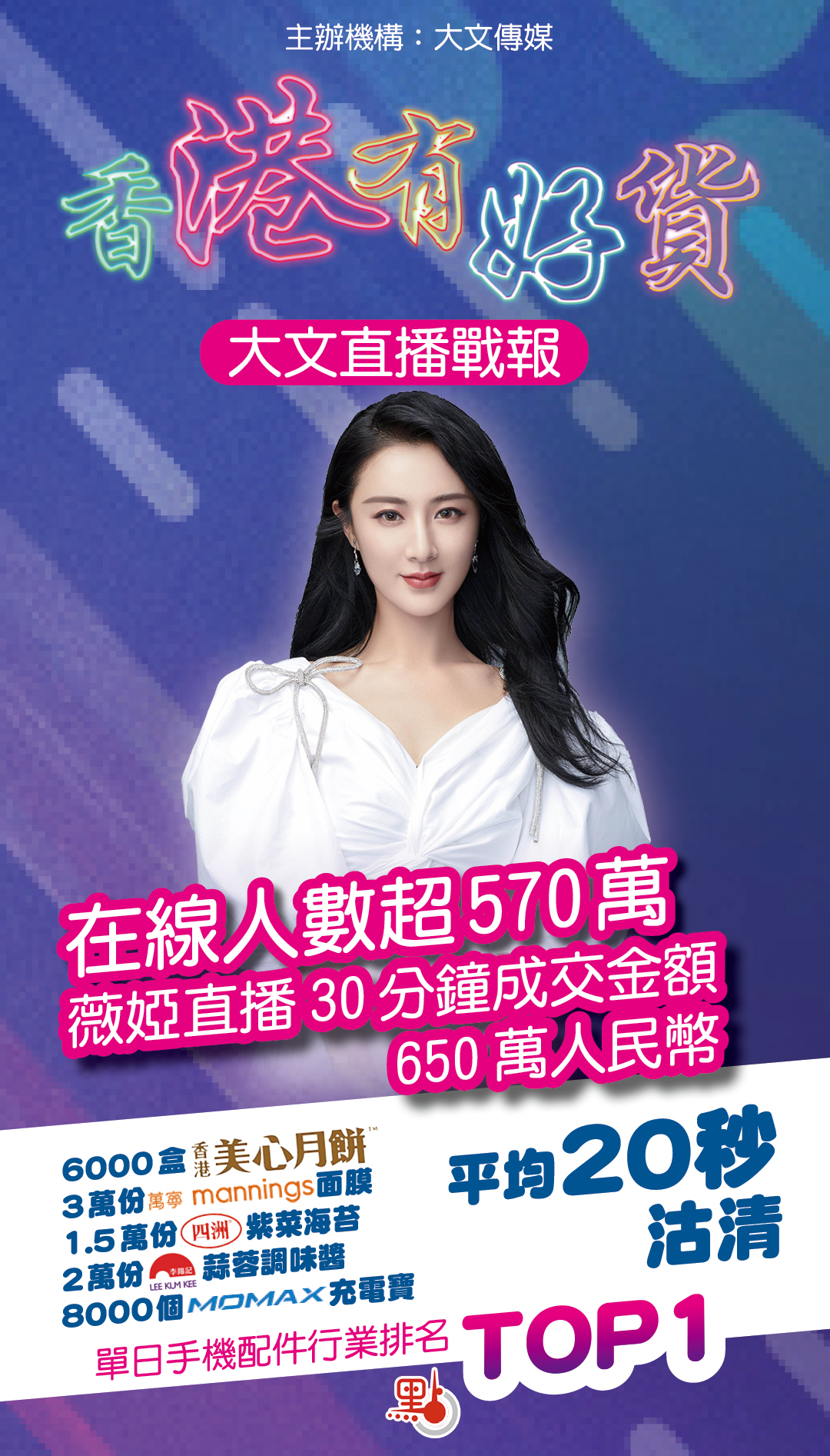 大公文匯全媒體報道:在線參與直播人數超過600萬,優質港貨平均20秒沽清, 「淘寶第一主播」薇婭直播帶貨30分鐘成交額就高達650萬人民幣……這份亮眼的「成績單」,來自香港大公文匯傳媒集團9月25日晚主辦的全港首次大型公益直播帶貨活動「香港有好貨」。