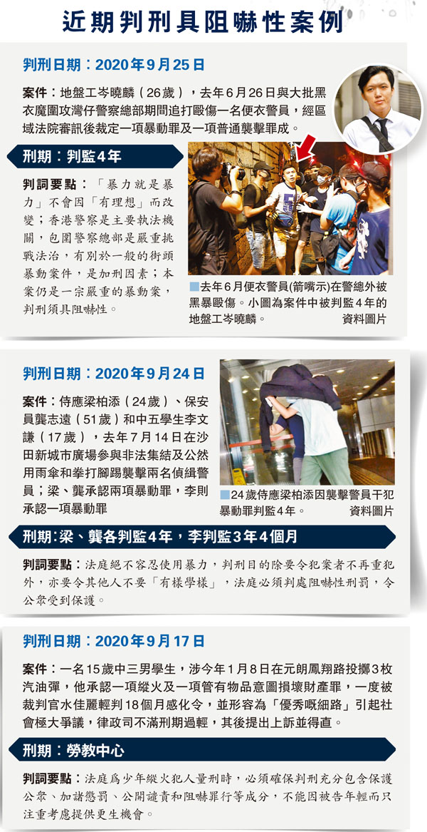 判詞要點:法庭絕不容忍使用暴力,判刑目的除要令犯案者不再重犯外,亦要令其他人不要「有樣學樣」,法庭必須判處阻嚇性刑罰,令公眾受到保護。