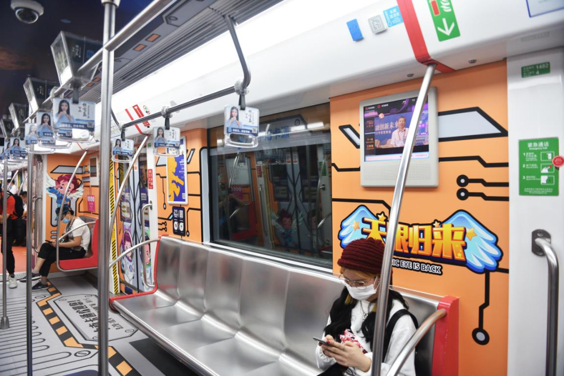 杭州動漫龍頭企業中南卡通以「天眼歸來 智享未來」為主題,將《天眼歸來》中的動畫形象融入地鐵車廂。走入車廂就彷彿進入了「太空艙」一般,腳下是星辰璀璨,抬眼是浩瀚宇宙,動畫片中的小伙伴們身著宇航服與天眼一起探索神祕的宇宙。