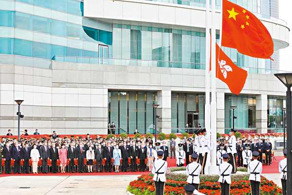 升旗儀式昨日上午8時在金紫荊廣場舉行。香港警察銀樂隊奏起樂曲,儀仗隊和護旗隊邁步進入金紫荊廣場。當莊嚴的《義勇軍進行曲》響起,中華人民共和國國旗及香港特區區旗伴隨着歌聲冉冉升起,特區政府飛行服務隊直升機在維多利亞港上空飛過,展示大型國旗和區旗,消防處滅火輪在維港海面噴灑水柱敬禮。不遠處,香港漁民團體聯會組織約40艘漁船在維港巡遊,船身懸掛國旗、區旗,展示着「祖國安定繁榮 香港明天會更好」等橫幅,船隊靠近金紫荊廣場時鳴笛致意。