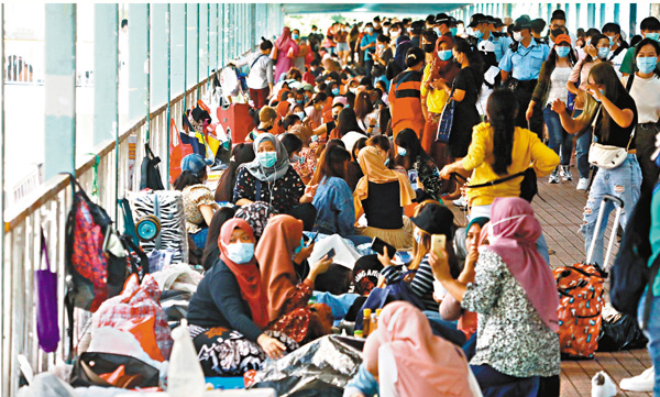 香港文匯報訊(記者 文森)不少市民在一連四天的國慶及中秋節假期外出消費,大批外傭亦趁假期與鄉親友好聚會,但外傭在新冠疫情緩和下,亦開始放鬆防疫意識,香港文匯報記者昨日在外傭聚集熱點所見,很多外傭無視「限聚令」規定,超過4個人聚集,其中旺角的行人天橋便擠滿外傭,有外傭認為疫情趨於穩定,相信感染風險不高。