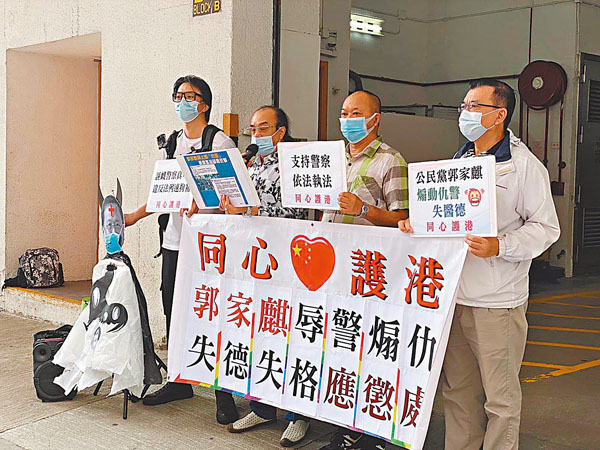 「同心護港」4位代表手持「郭家麒辱警煽仇 失德失格應懲處」的橫額,及郭家麒魔鬼人偶,高叫口號表達不滿。團體批評郭家麒早前於社交媒體公開侮辱警察為「一堆綠色物體」,有目的地無理指控公職人員的執法行動,更以「奴隸」來形容維持社會生命財產的公僕,無恥地利用公眾平台煽動仇恨。團體指出,曾就郭家麒行為諮詢法律意見,其所作所為可能涉嫌違反香港法例第200章《刑事罪行條例》第10條禁止具「煽動意圖」,促請警方調查,如有違法,速速拘捕。