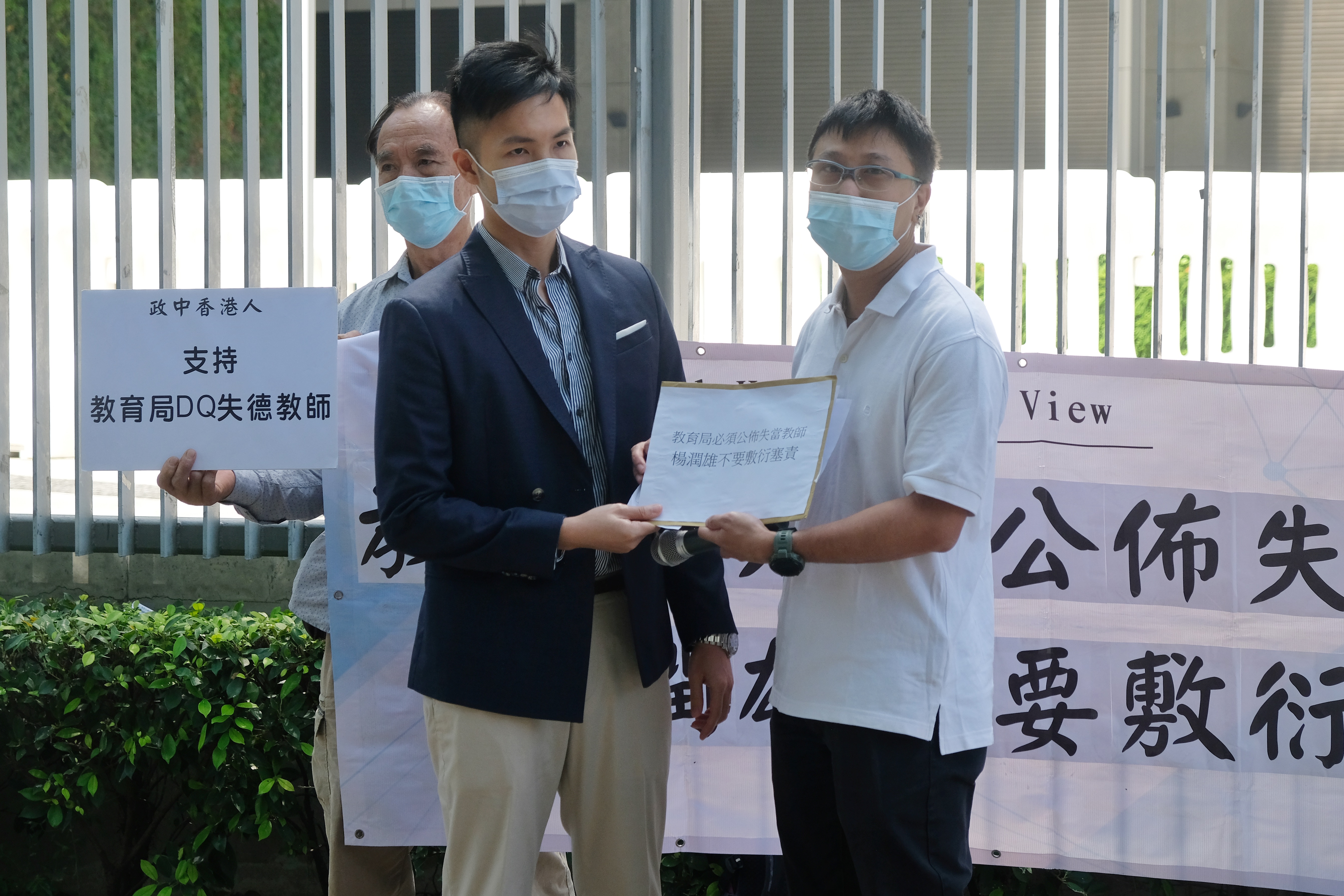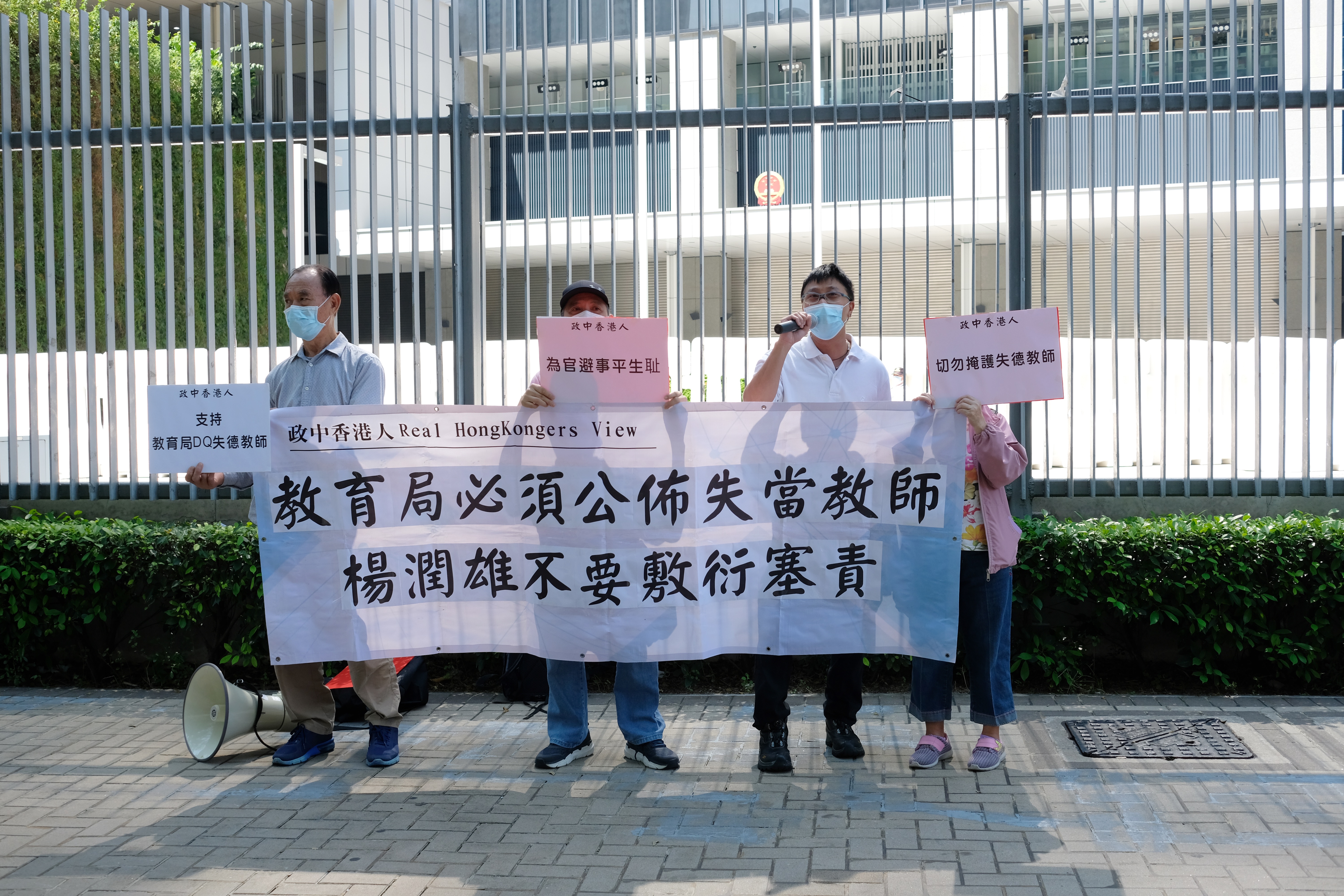 團體「政中香港人」4名成員在政總外拉起寫有「教育局必須公布失當教師、楊潤雄不要敷衍塞責」的橫額;部分人更手持「為官避事平生恥」的標語,又叫「切勿掩護失德教師」等口號,批評當局至今仍拒絕公開失德教師的資料。