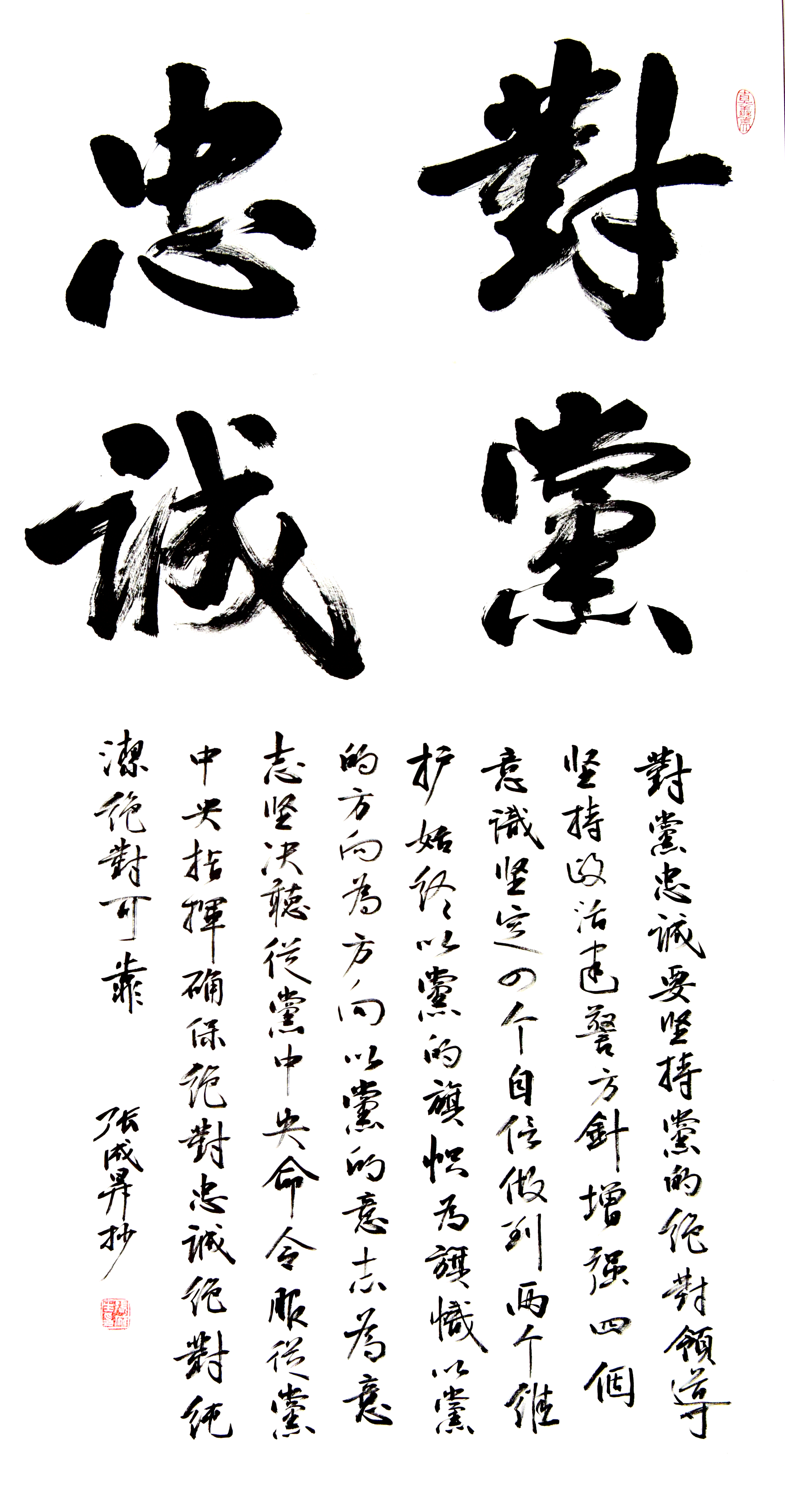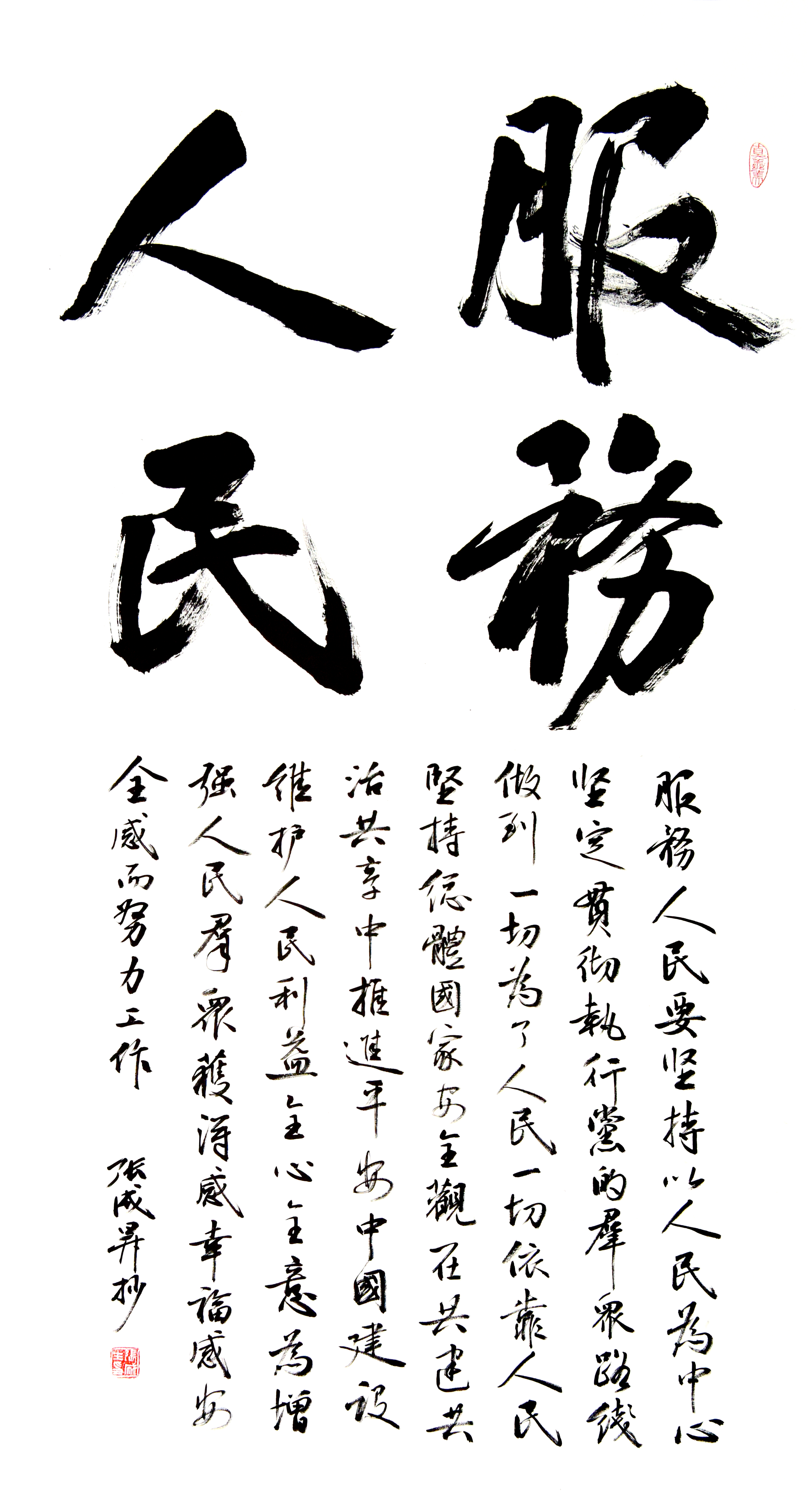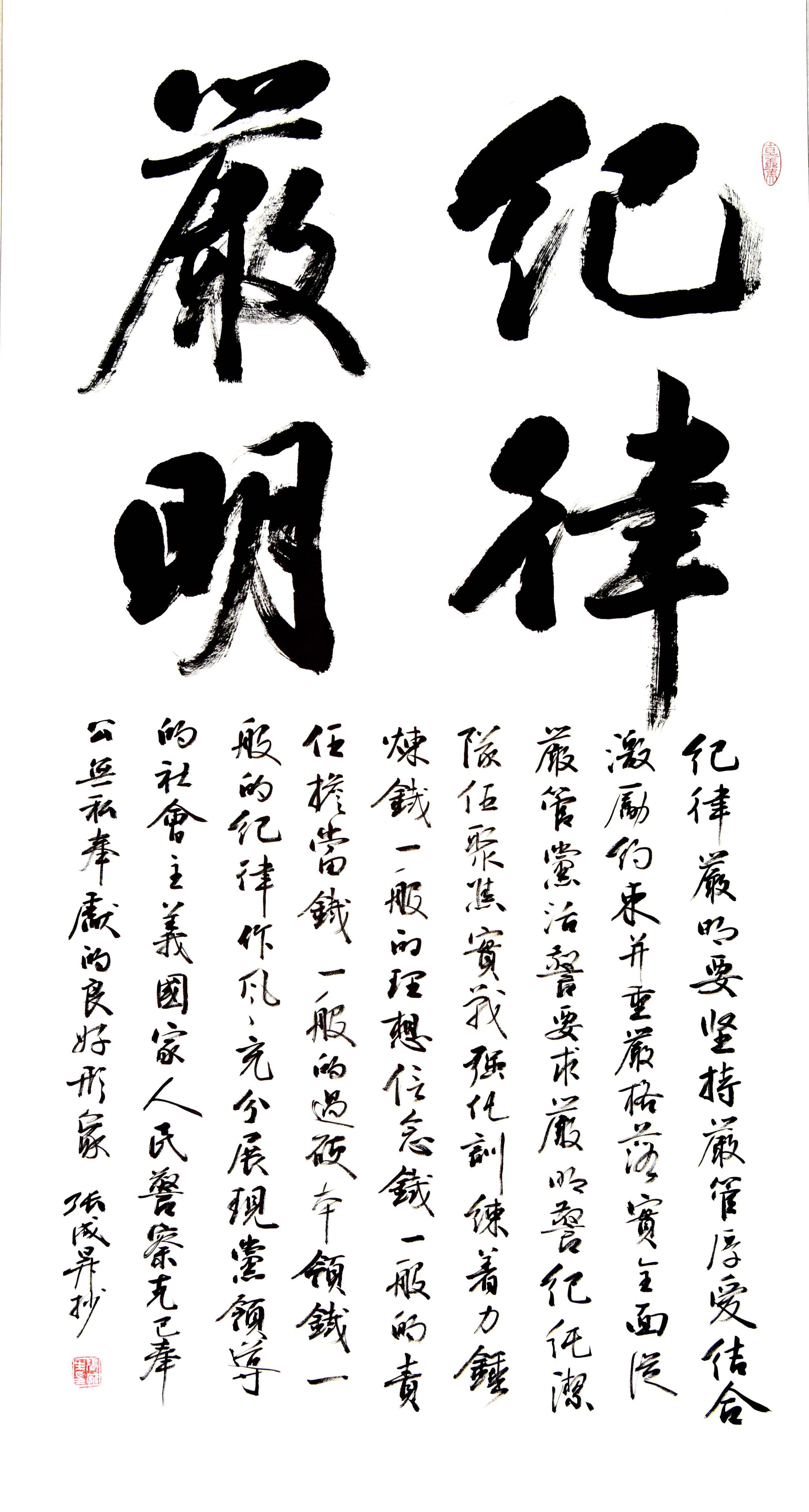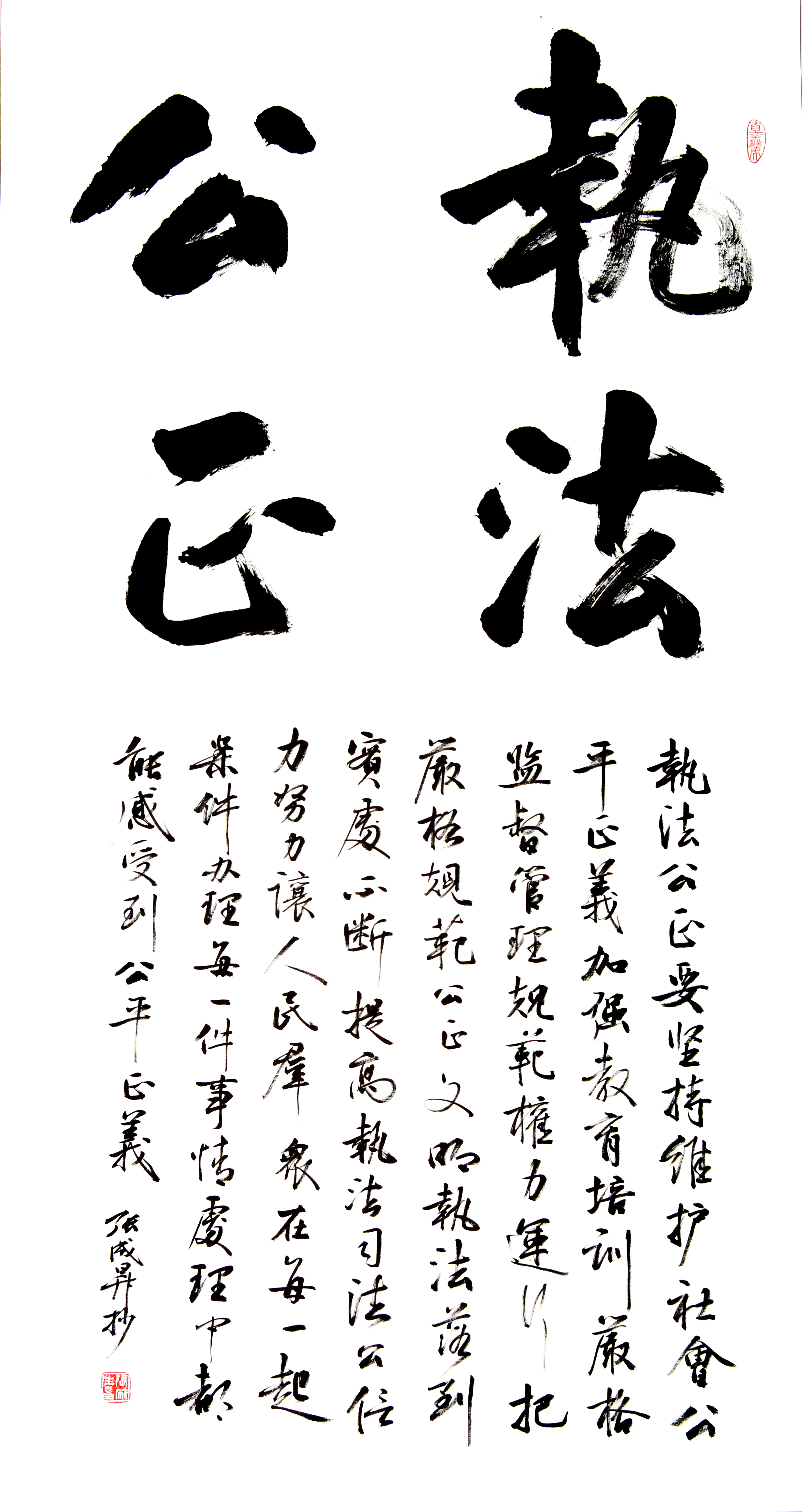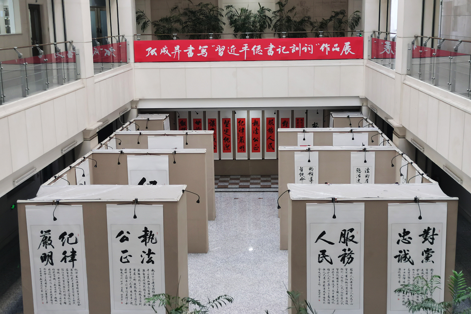 據了解,此次作品展共展出以習近平總書記在中國人民警察警旗授旗儀式上的訓詞全文為內容創作的大、中、小幅行楷書法作品40餘幅,均由張成生利用業餘時間手書完成,從謀篇、布局、章法、結構、創意中,彰顯着作者滿懷愛黨愛國愛警深情極富感情。