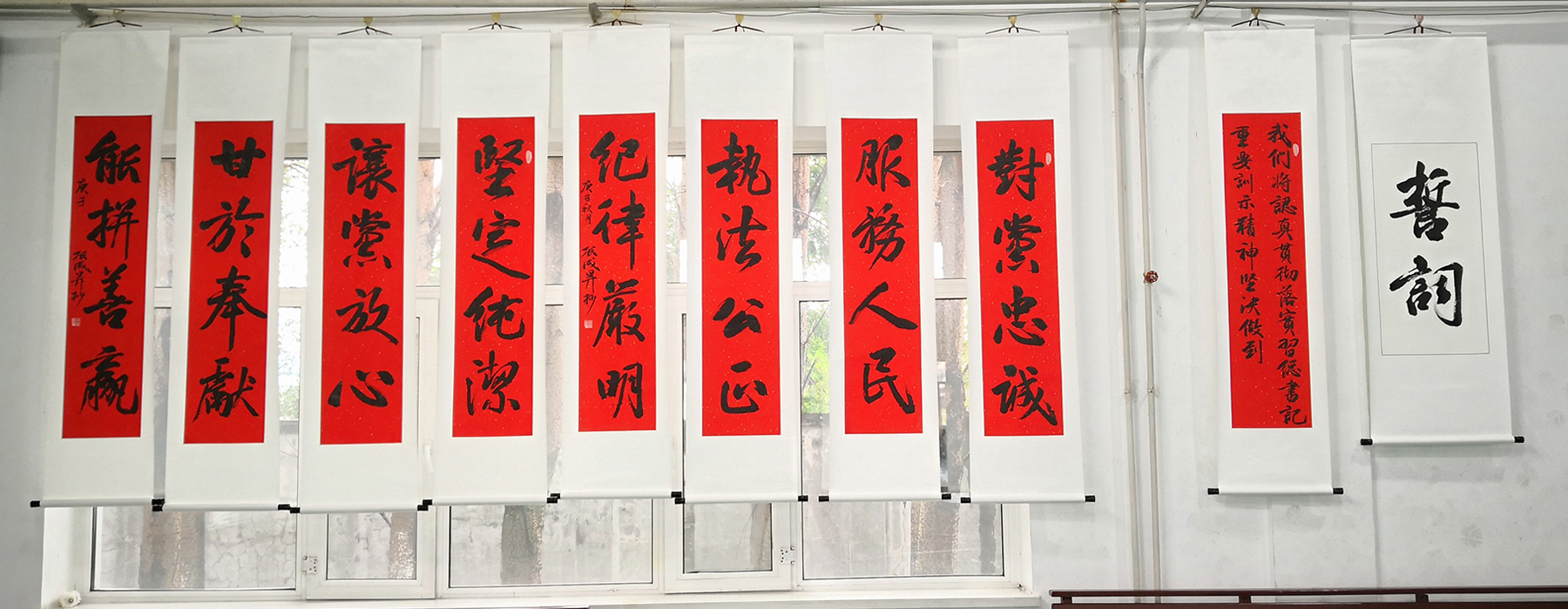 步入展區,「對黨忠誠、服務人民、執法公正、紀律嚴明」4幅紅色金星書法捲軸作品映入眼帘、格外醒目、催人奮進。這些書法作品筆力遒勁,大字榜書恢宏壯觀、氣勢磅礴,精緻小楷舒展氣朗、清新雋永,吸引了絡繹不絕的觀眾紛紛駐足欣賞、拍攝分享、低聲誦念,深深沉浸其中。