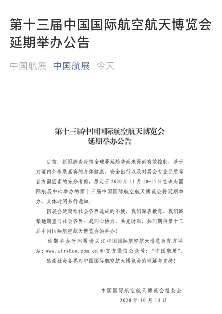 公告稱,目前新冠肺炎疫情全球蔓延趨勢尚未得到有效控制,基於對境內外參展嘉賓的身體健康、安全出行以及對展會專業品質等各方面因素的充分考慮,原定於2020年11月10日至15日在珠海國際航展中心舉辦的第十三屆中國國際航空航天博覽會將延期舉辦,具體時間另行通知。