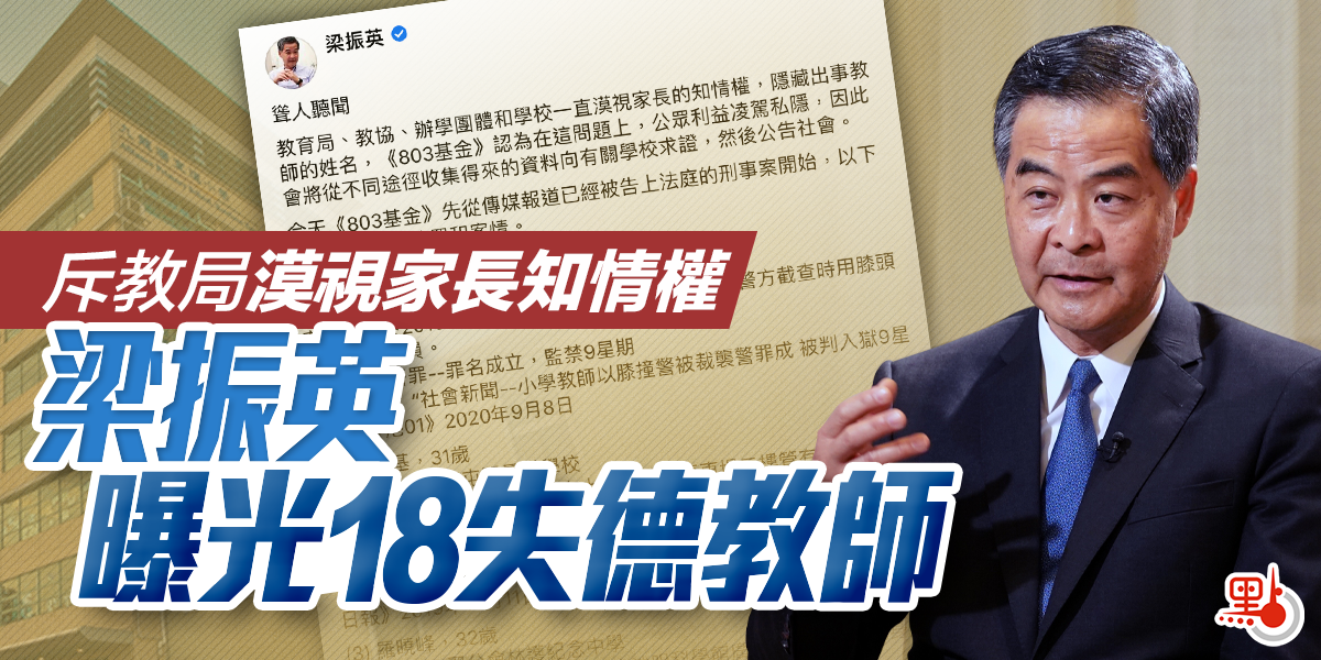 大公文匯全媒體報道:全國政協副主席、前行政長官梁振英及其創立的「803基金」早前申請司法覆核,要求教育局公開被裁定專業操守失當的教師資料及學校名稱,但教局遲遲未有動靜。今日(13日)梁振英在社交平台以《聳人聽聞》為題發文,直斥教育局、教協、辦學團體和學校一直漠視家長的知情權,隱藏出事教師的姓名,他還在文後詳列18名涉襲警、暴動及非法集結等罪的教師及補習老師的姓名及其任教學校。