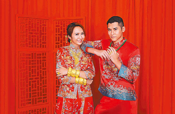 香港文匯報訊(記者 李思穎)陳家樂和余香凝分手兩年,各自在感情世界上擁有一片天空,家樂被傳與緋聞女友連詩雅低調發展,余香凝則驚爆奉子成婚,女方日前放上跟另一半牽手的甜蜜婚照承認婚訊,心情沒受影響的家樂在昨日同告發出中式婚照「鬥閃」,然而相中另一半是工作上的熒幕情侶湯怡,純粹是為英皇珠寶拍攝「中式足金婚嫁系列」廣告。