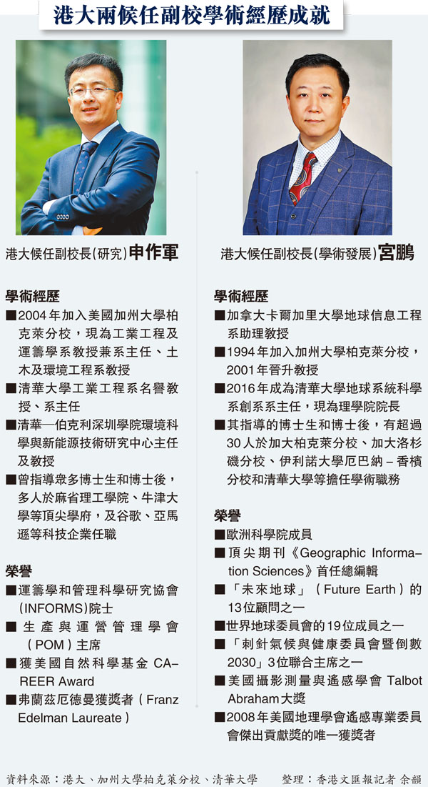 大學人事任命素來享有院校自主,按學術、研究成就和能力等條件自行決定人選。香港大學校委會昨日以絕大比數,通過委任兩名來自加州大學柏克萊分校與清華大學的頂尖學者申作軍及宮鵬為候任副校長,任期5年。港大強調任命是全球物色人選的成果,唯一目的是招攬最優秀人才,校長張翔則表示,二人拓展研究及招攬世界級人才的職務對大學至為重要。就坊間對兩人背景的傳聞和猜測,港大校委會主席李國章透露他們已特意向校委會澄清,內容令人滿意,校委會認為所有指控皆不成立。■香港文匯報記者 姬文風、于錦言