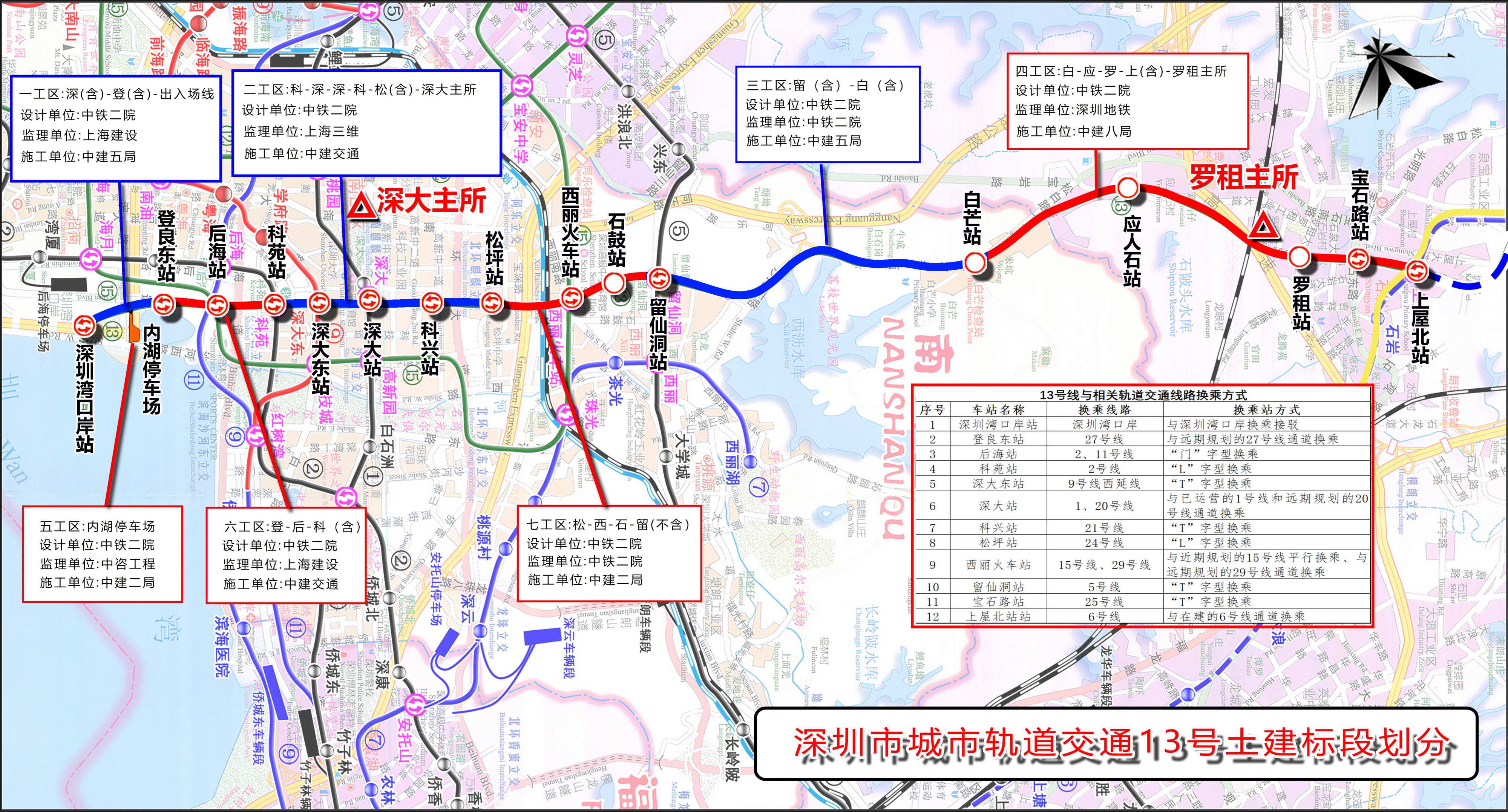 深圳市軌道交通13號線工程是支持後海中心、留仙洞總部基地、光明新城等重點建設地區發展的中部地區南北向骨幹線。線路南起深圳灣口岸站,北至上屋北站,全長約22.4公里,設站16座,採用地下敷設方式。初步預計將於2023年投入服務。